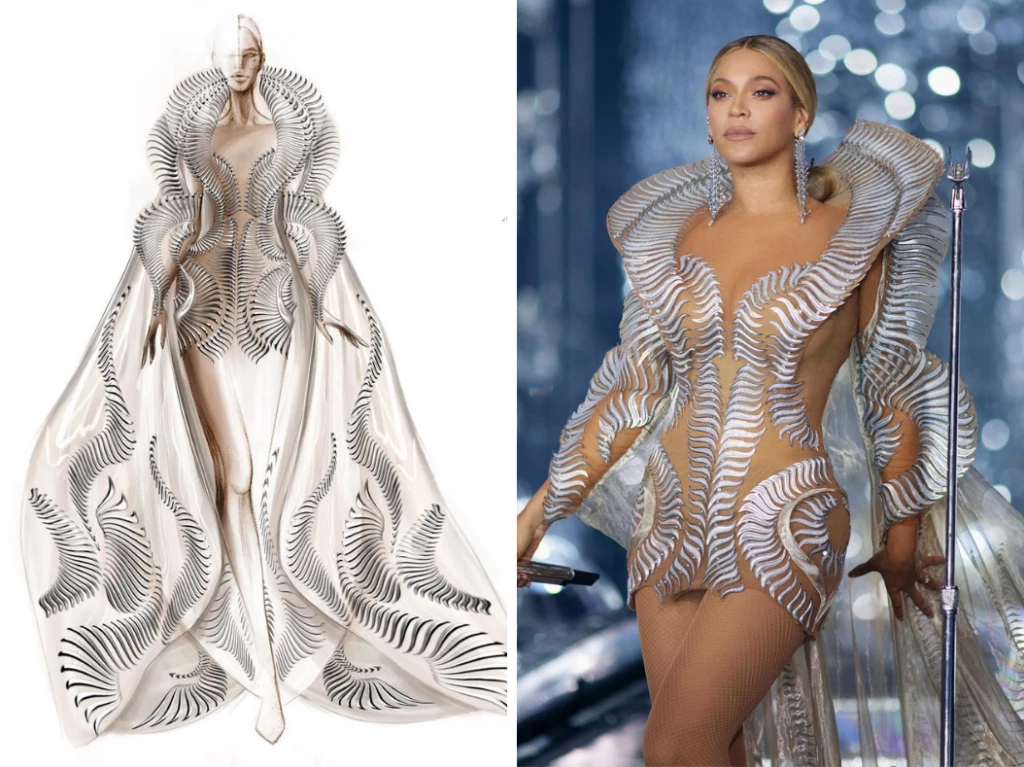 Uno de los diseños más impresionantes de la gira mundial de Beyoncé lleva la firma de la diseñadora holandesa Iris van Herpen, confeccionado por 12 personas a partir de 980 formas de pétalos diferentes en 3D mediante la fundición de silicona de mármol de plata, cristales de Swarovski y una capa de organza de vidrio.