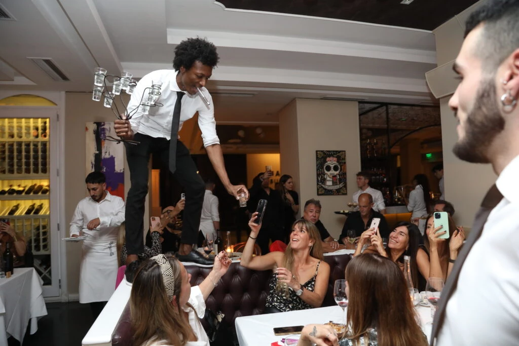 Tras la cena, Castro y el grupo convocado por Mateu disfrutó del icónico ritual de Bagatelle. La marca registrada del restó, es sin dudas, el momento post comida en el que los camareros y camareras del lugar se suben a las mesas, con bengalas en la mano y un buen surtido de copas para repartir entre los invitados.
