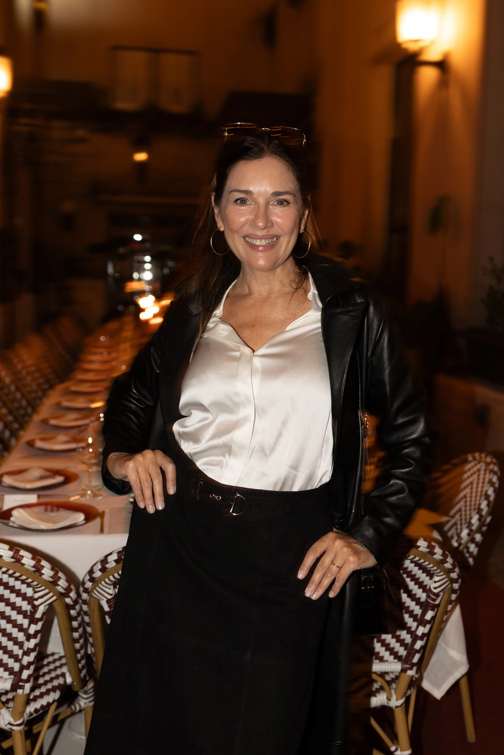 Otra de las figuras presentes fue Andrea Frigerio, quien asistió al lanzamiento de la nueva colección de la firma DEMARIA acompañada por su hija Fini Bocchino. La actriz optó por un look clásico y elegante: una blusa de satén color marfil combinada con una falda negra de tiro alto y una campera de cuero que le aportó un aire moderno al conjunto. Completó el estilismo con aros argolla y un maquillaje luminoso.