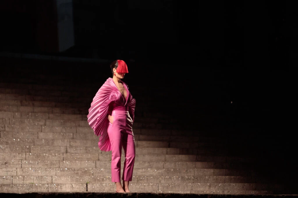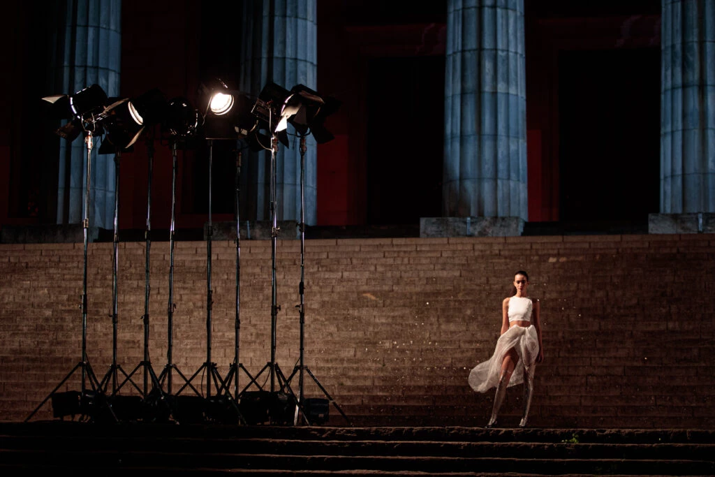 Las líneas de las escalinatas dieron origen a plisados y tableados, rematados en siluetas longilíneas y muy avant garde. Los diseños que las modelos lucieron mientras bajaban por las emblemáticas escalinatas pertenecen a la última colección del diseñador (y anestesiólogo), bautizada Escala.