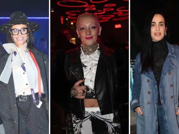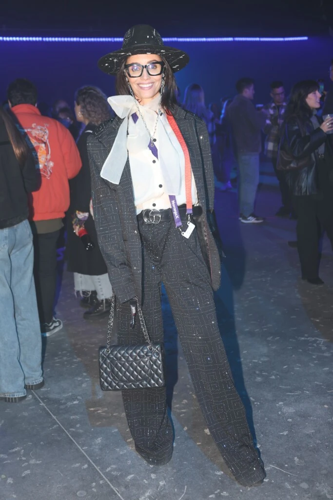 Paz Cornú, por su parte, eligió un conjunto de traje oscuro con brillos, una camisa blanca con lazo, sombrero negro, lentes de marco grueso y una cartera acolchada negra, logrando un balance perfecto entre comodidad y estilo.