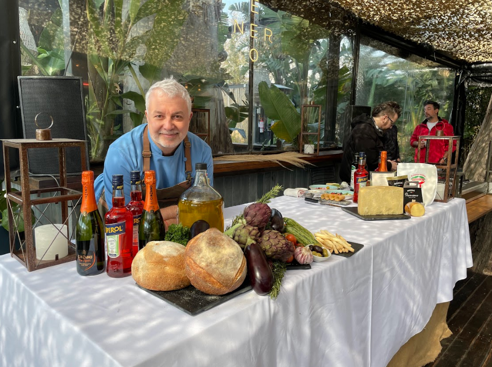 La esencia del evento estuvo enfocada en un menú mediterraneo. El antipasto estuvo compuesto por: carciofi alla Romana, Parmigiana di melanzane, tre formaggi, frutta di stagione bruciata e mascarpone, olive e grissini, bruschette al Prosciutto e olio d'oliva, torta di zucca, Ricotta e grana padano.