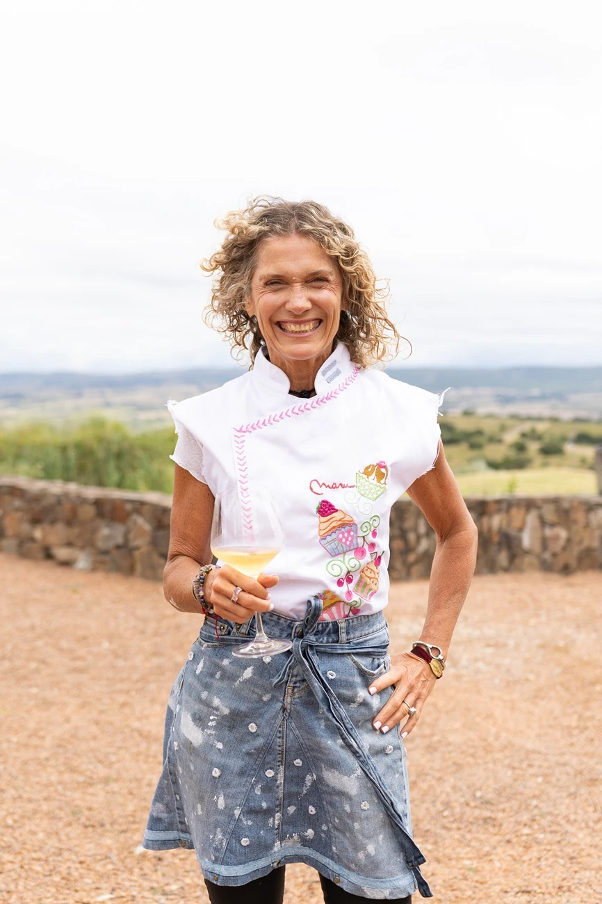 Maru, fiel a su estilo, se corrió del uniforme clásico y llevó un look con sello propio: camisa blanca sin mangas con bordados coloridos y espíritu divertido, en sintonía con su universo dulce. La combinó con falda denim cruzada y lazo en la cintura, un gesto práctico y fresco, y sumó calza negra para resolver el clima y el terreno con comodidad. El resultado fue un outfit relajado, funcional y encantador, de esos que se sienten auténticos.