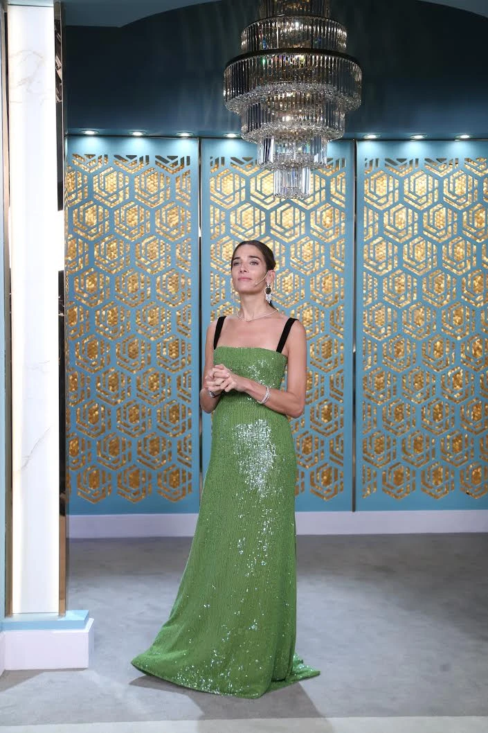 Vestido columna en micropaillets oliva tornasolado y tirantes de terciopelo negro.