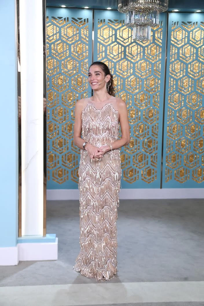Diseño columna con motivos étnicos, transparencia en bustier y flecos de pailletes.