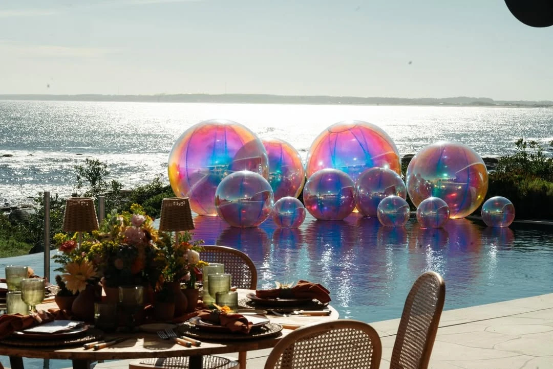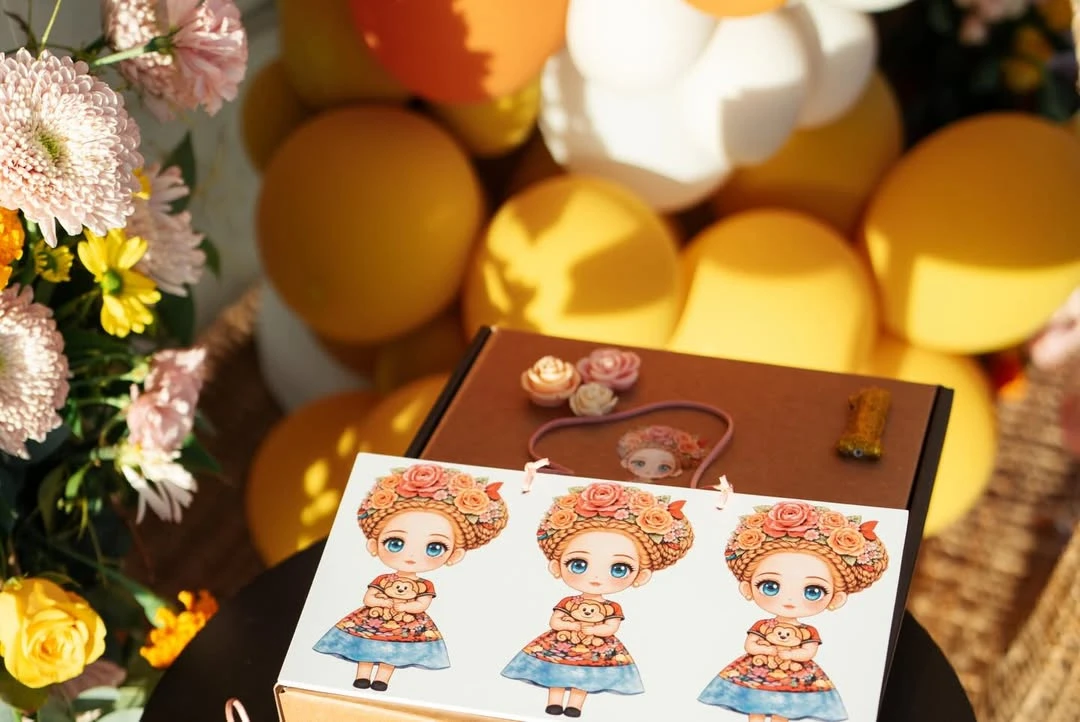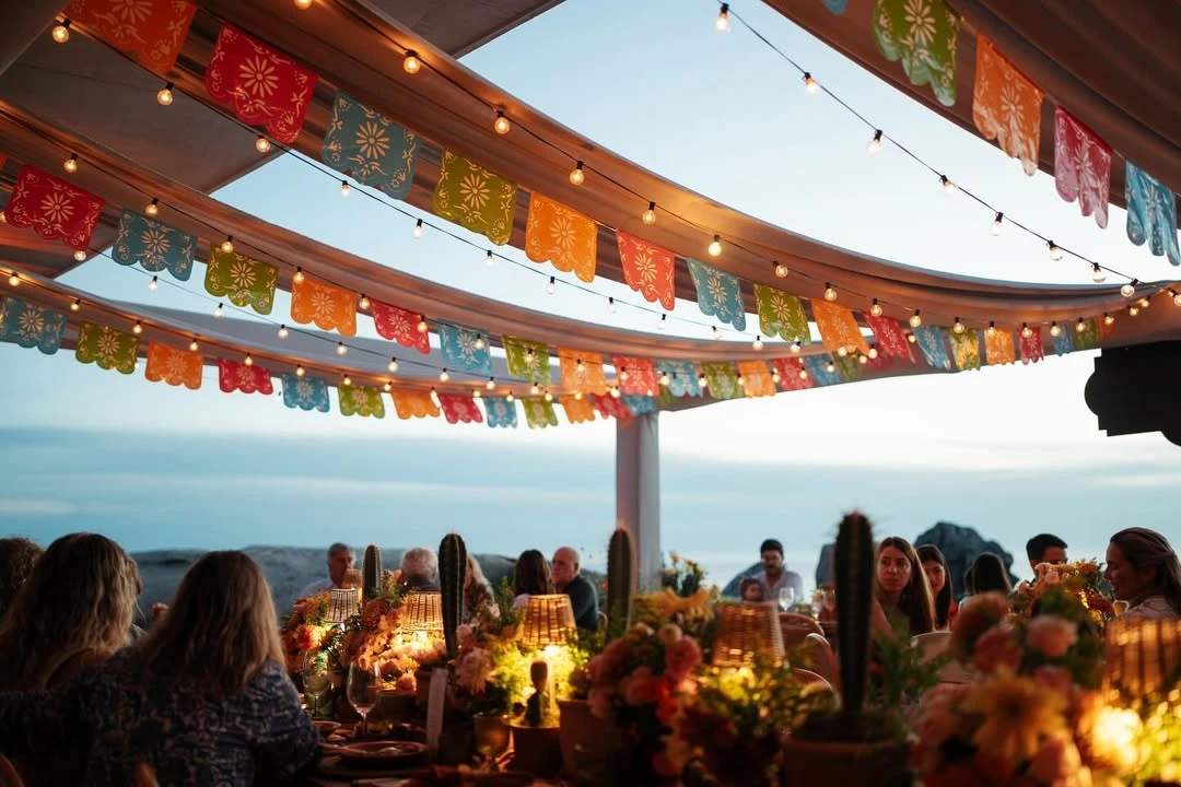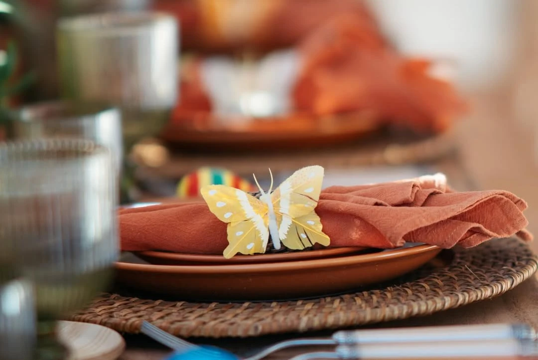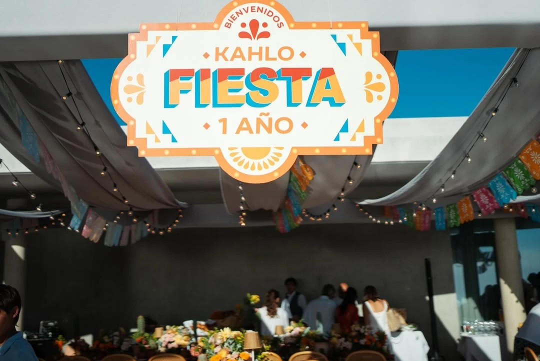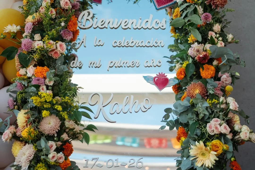 La celebración tuvo una estética mexicana que dialoga con el nombre de la homenajeada: Kahlo. Desde la entrada, un gran cartel de “Kahlo Fiesta – 1 año” daba la bienvenida bajo guirnaldas de papel picado multicolor y luces cálidas que enmarcaban la escena al caer la tarde. La mesa, pura inspiración editorial, combinó bajoplatos de fibras naturales, vajilla terracota, servilletas en tonos teja y copas verdes acanaladas. El toque poético lo daban mariposas amarillas posadas sobre cada lugar: un detalle delicado que se repetía en varios rincones.