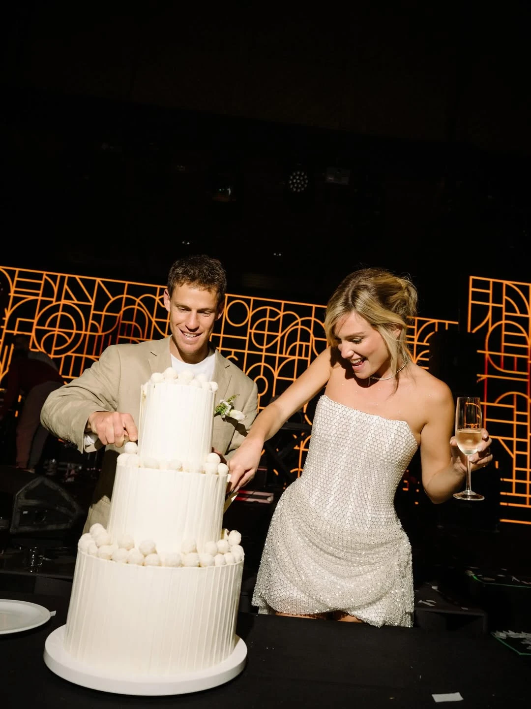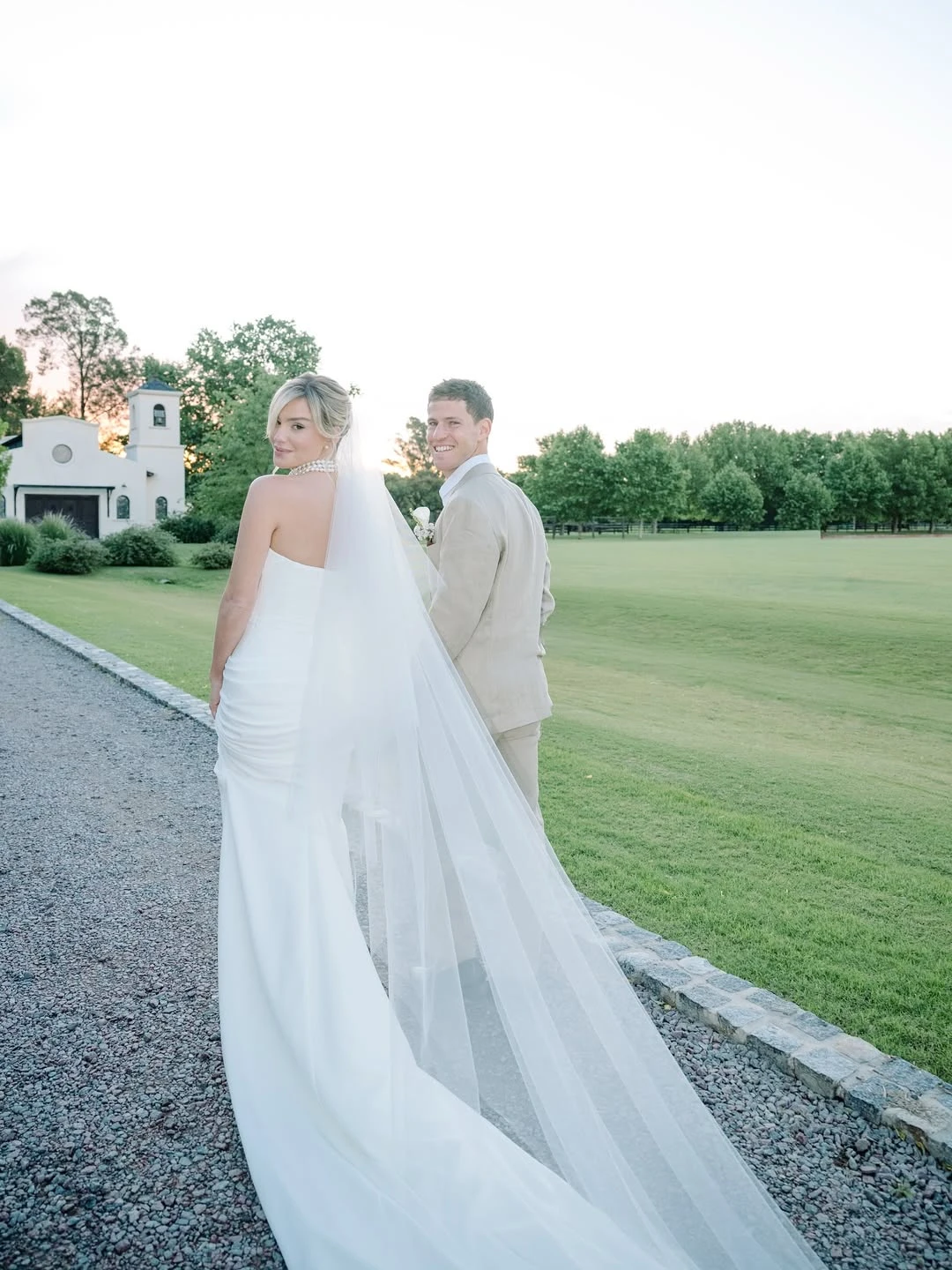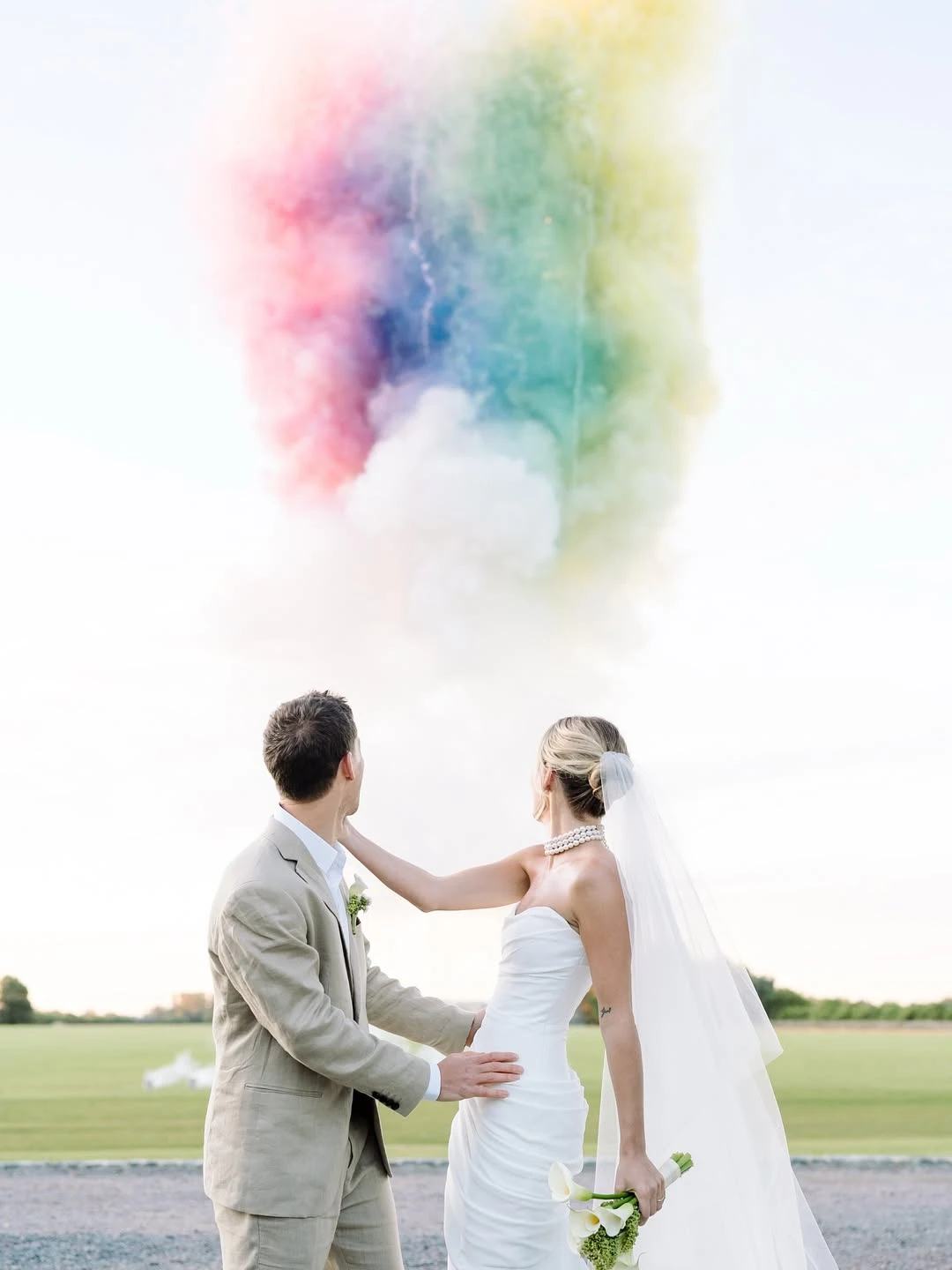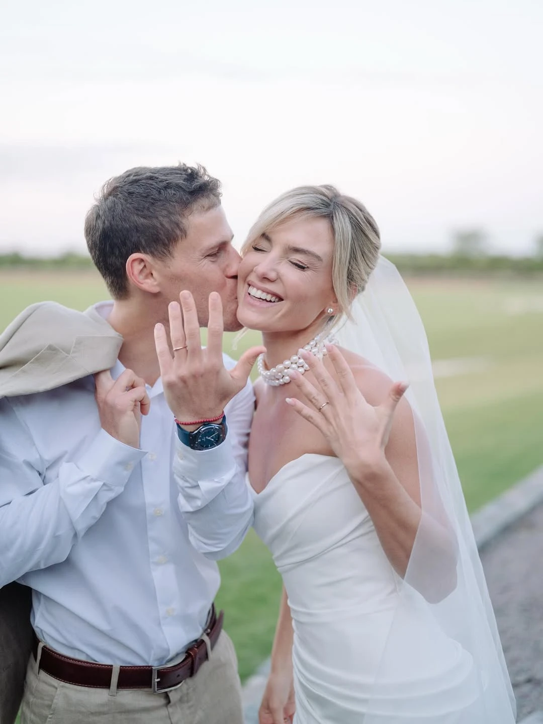 La ambientación, de inspiración campestre y glamorosa, combinó el aire rural del campo con detalles de lujo: mesas junto al lago, guirnaldas de luces, vajilla de diseño y centros de mesa florales. Uno de los rincones más fotografiados fue la torre de copas de cristal, donde los novios descorcharon el champagne para brindar con sus invitados.