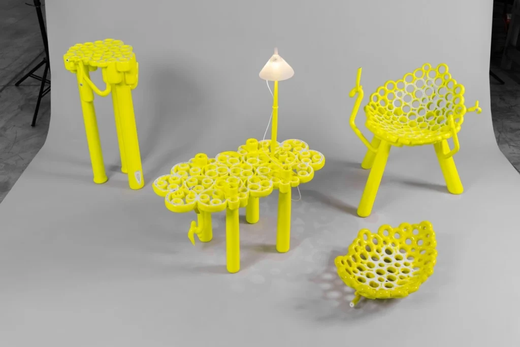 “Hiperpintura” es el resultado de aplicar sucesivas capas de pintura en polvo termoconvertible sobre una estructura metálica, la pintura deja de ser simplemente una terminación para convertirse en un volumen moldeable y mecanizable, marcando una verdadera innovación en la historia mundial del diseño. Esta colección explora la intersección entre escultura y mobiliario, entre producción industrial y artesanía, entre tiempo productivo y tiempo dilatado dando lugar a piezas únicas e irrepetibles.