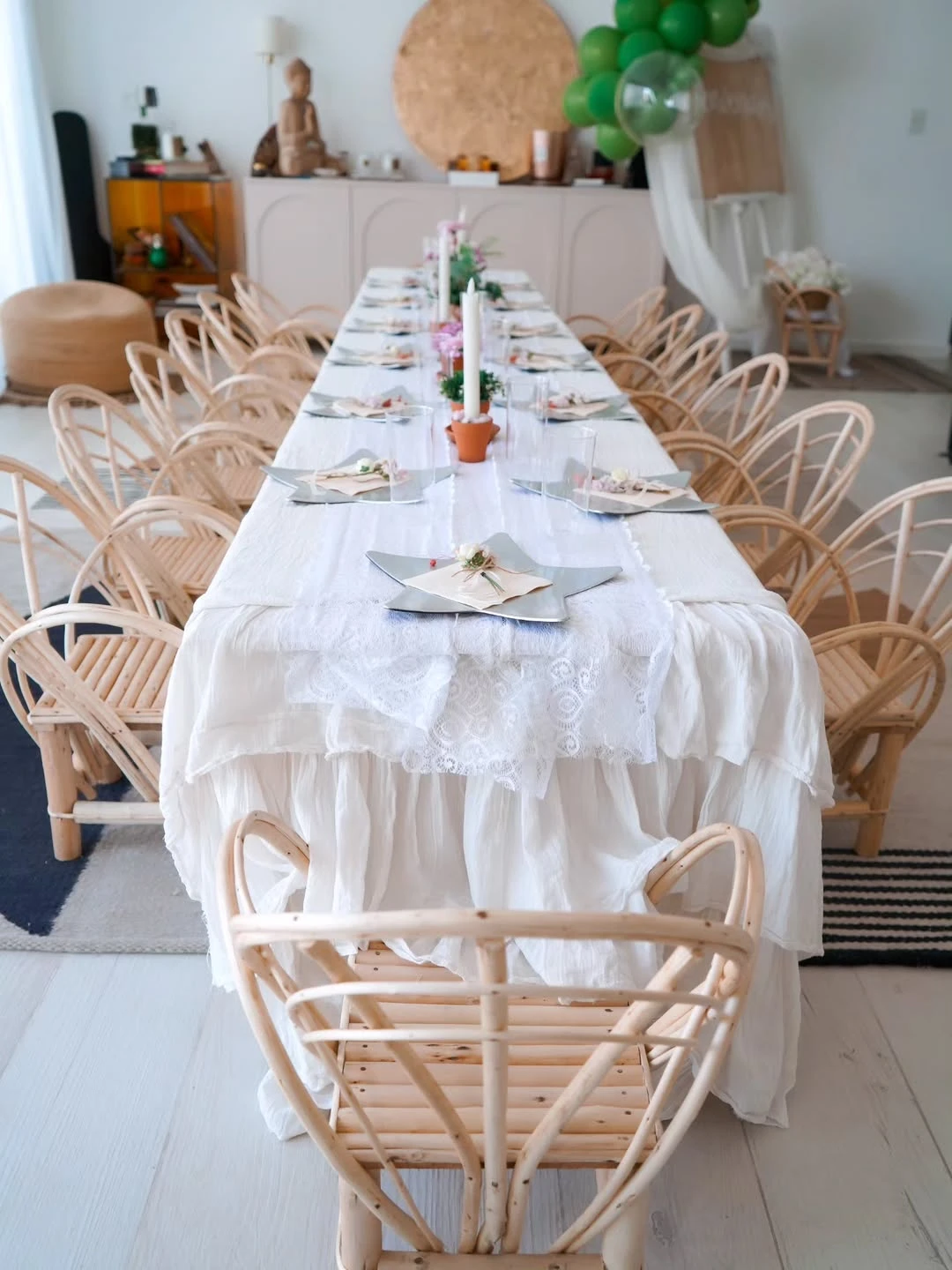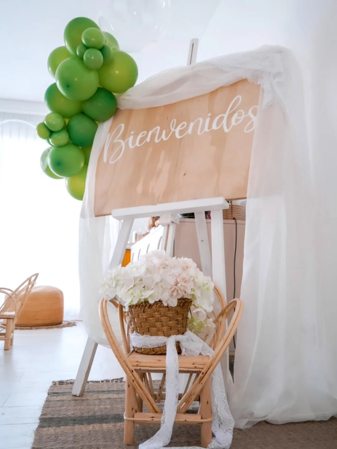 Según las imágenes que compartió en Instagram, el ambiente se vivió en un clima cálido y natural, donde la estética fue protagonista. Las invitadas fueron recibidas al llegar del colegio con un gran cartel de bienvenida rodeado de globos verdes. El living estaba decorado con mesas cubiertas por manteles blancos, delicados detalles florales, y sillas de mimbre, creando un aire de fiesta de cuento. Flores, jarrones rústicos con colores pastel y velas sobre las mesas aportaron frescura.