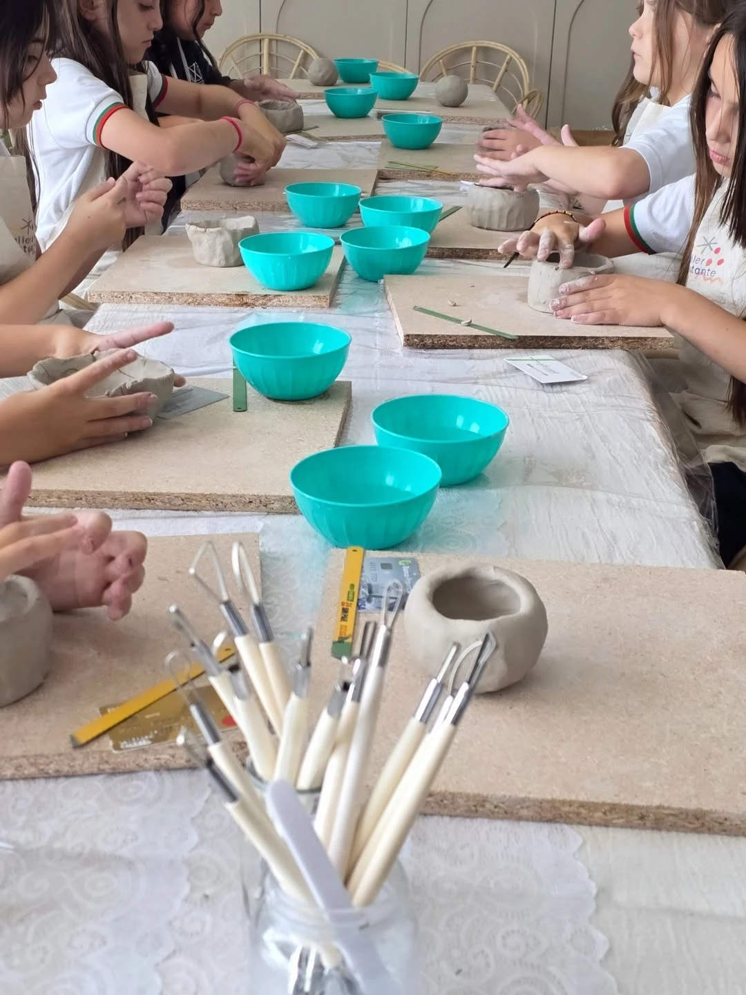 El toque especial del evento residió en las actividades temáticas, diseñadas para fomentar la imaginación. Después del momento dulce, llegó la parte más creativa con un taller de cerámica. Inspirada en la sensibilidad artística de Gina, Emilia organizó una actividad donde cada niña pudo modelar y pintar sus propias piezas. Para esto, se dispuso una larga mesa con herramientas, materiales y bowls individuales que transformaron el espacio en una pequeña escuela de arte.
