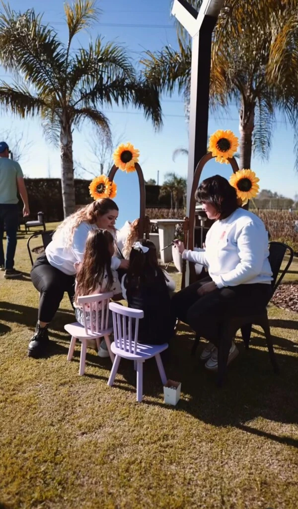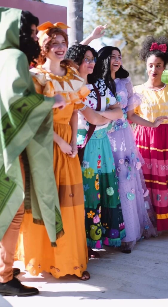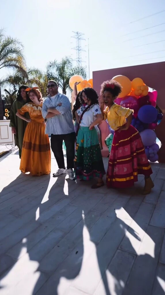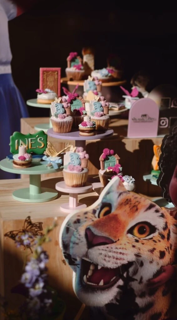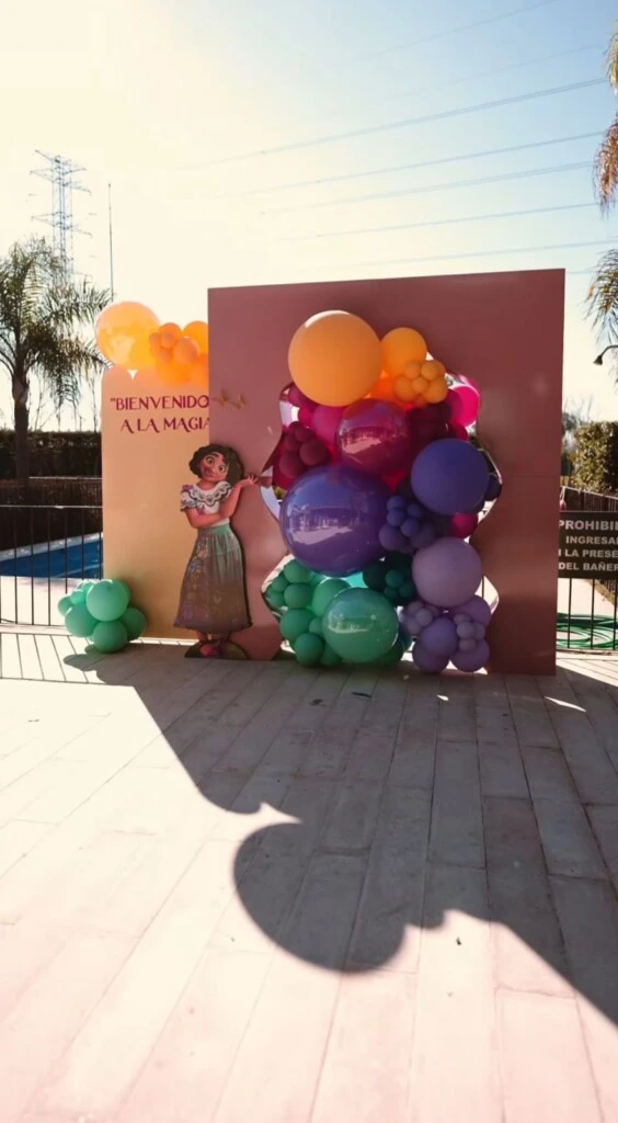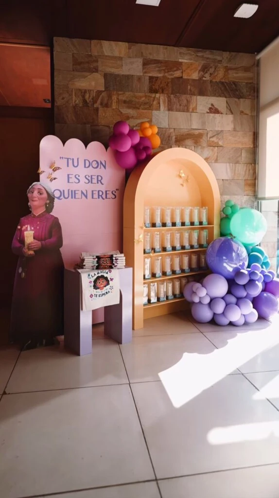El evento se llevó a cabo en un amplio salón con espacio al aire libre, que fue transformado completamente en un escenario de fantasía. Los invitados fueron recibidos por arcos de globos y flores frescas, mientras el parque se llenó de color. Las mesas lucieron manteles en tonos pasteles y centros de mesa florales, con un gran backdrop dedicado a Mirabel y la familia Madrigal. Y al atardecer, un techo de luces LED intensificó la atmósfera mágica.