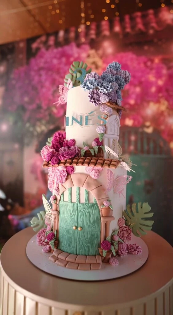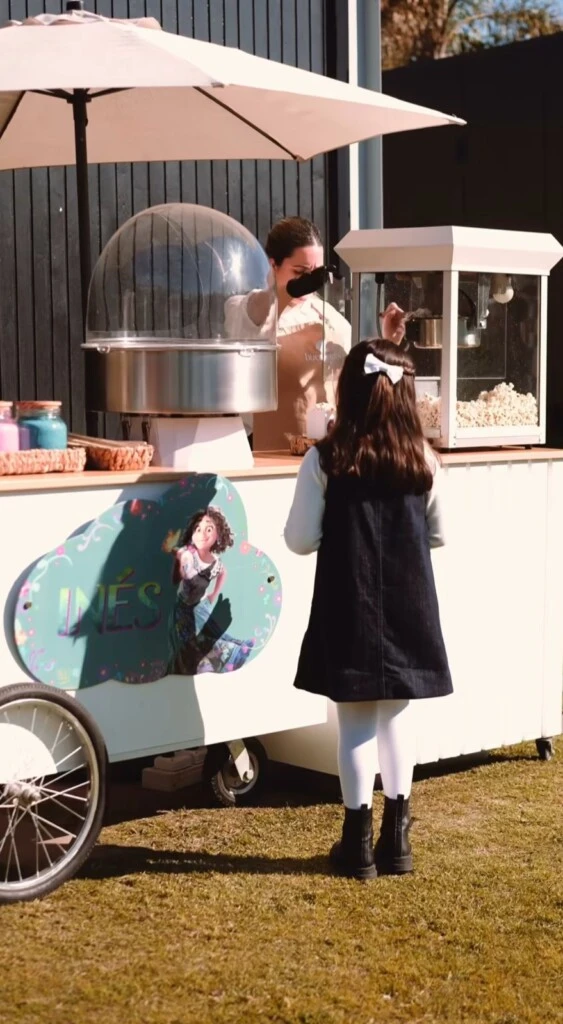 Mientras que, la propuesta gastronómica incluyó una mesa de dulces, cupcakes temáticos, frutas frescas y una monumental torta decorada con flores y mariposas de azúcar, con el nombre Inés y elementos arquitectónicos de la casa Madrigal. Un carrito de pochoclos vintage fue muy popular.