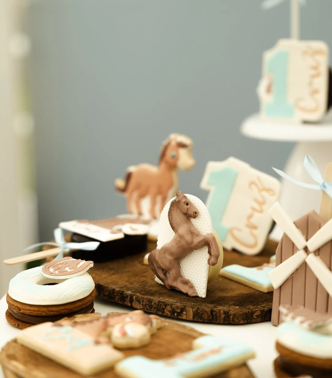 Con una temática de caballos, tanto la torta como gran parte de la decoración lucía al animal en medio de un paisaje campestre, con espacios que emulaban un granero, interrumpido por divertidos rincones como peloteros y un arenero con diferentes juguetes para modelar.