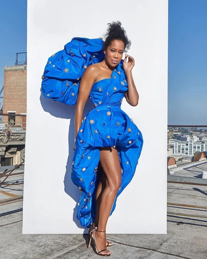 Regina King (49), la estrella de Watchmen que hoy podría ganar su cuarto Emmy, eligió un vestido azul de Schiaparelli Couture y zapatos de Stuart Weitzman.