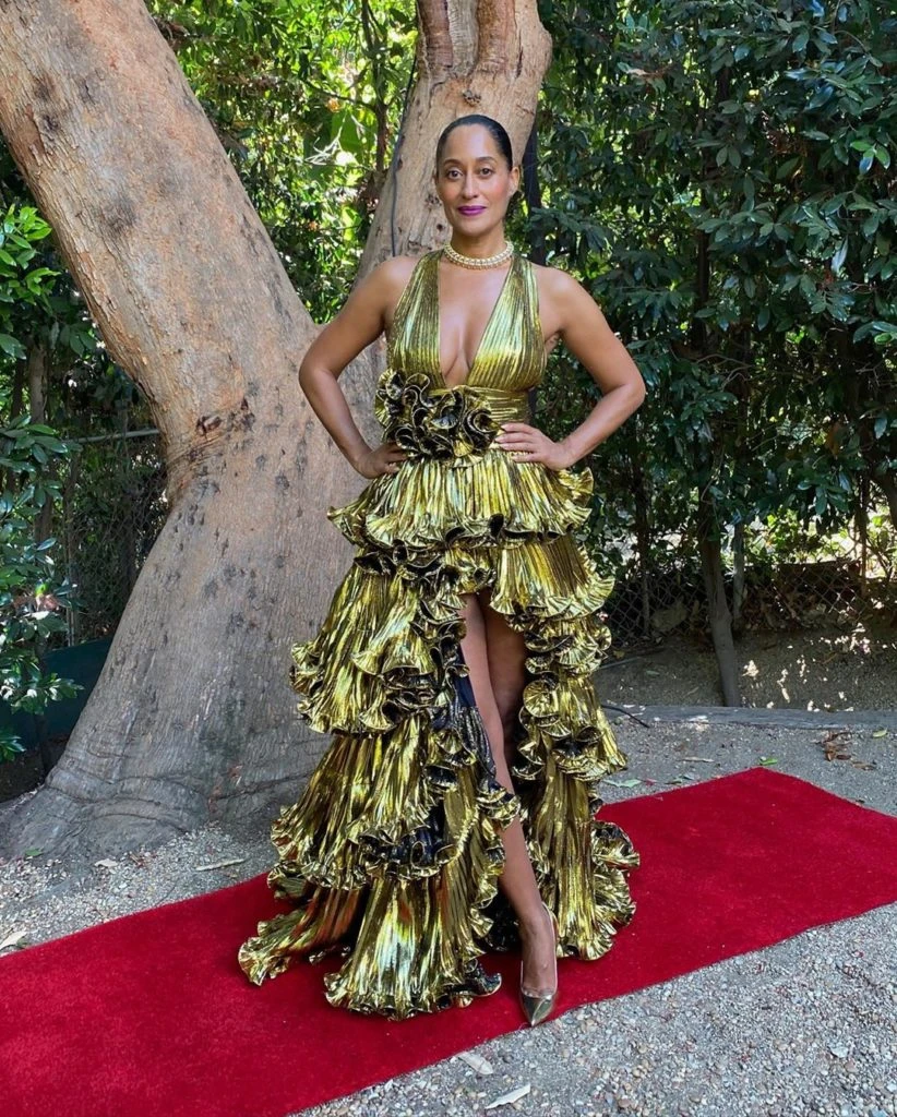 Tracee Ellis Ross (47), la estrella de Black-ish, con un vestido dorado de Alexander Vauthier, zapatos Jimmy Choo y joyas vintage de Tiffany & Co.