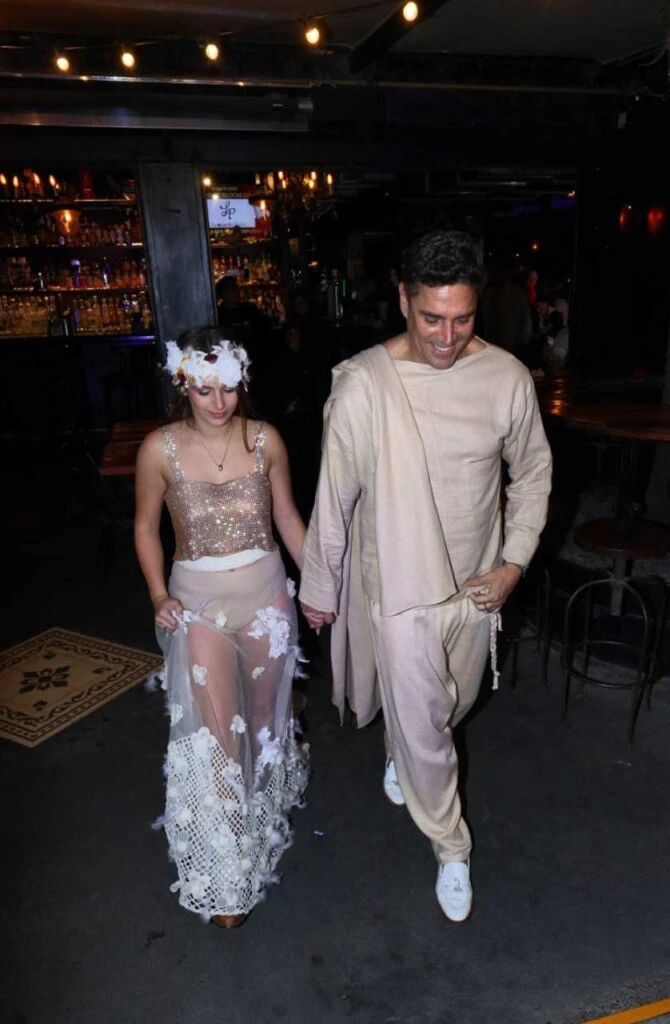 En tanto, ella optó por una falda de gasa transparente con diseños bordados en la parte de abajo, top de brillos dorados y una corona de flores blancas y amarillas en su cabeza.