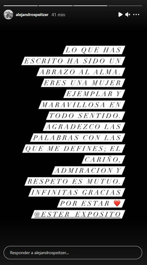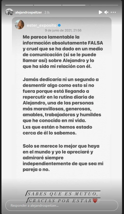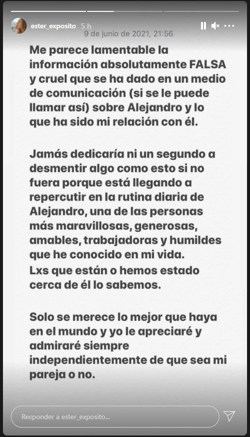 "Me parece lamentable la información absolutamente FALSA y cruel que se ha dado en un medio de comunicación (si se le puede llamar así) sobre Alejandro y lo que ha sido mi relación con él", comenzó la actriz en sus historias de Instagram.