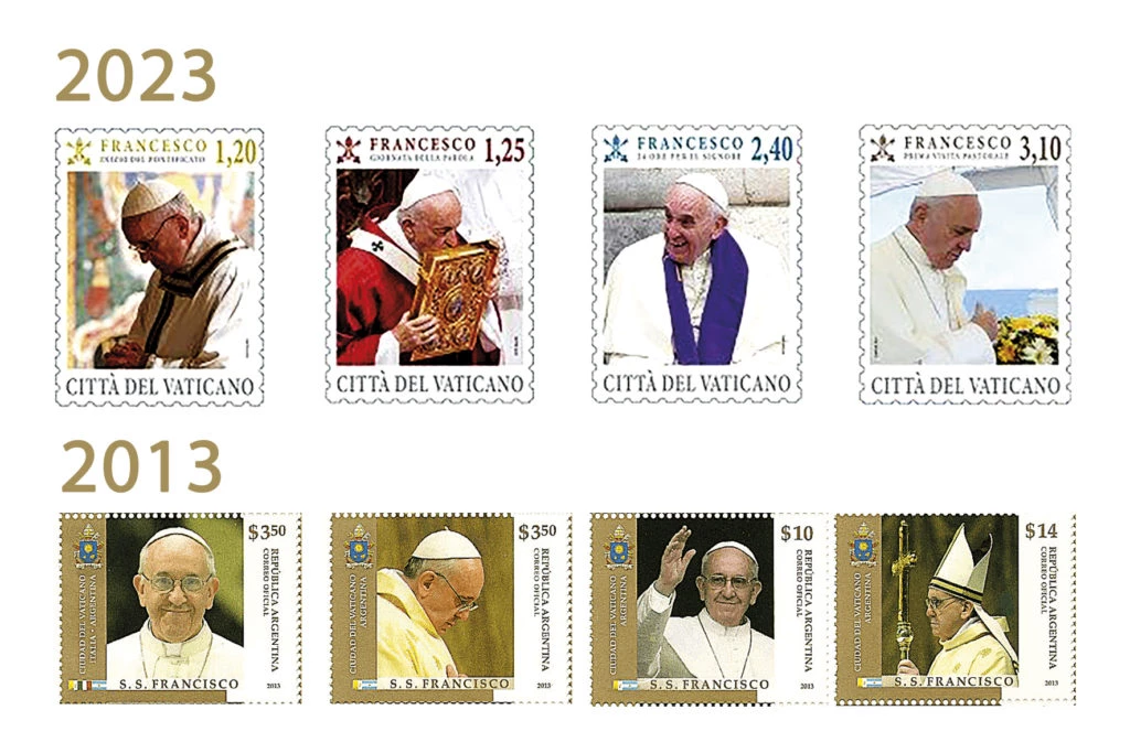 En honor al décimo aniversario de la elección del papa Francisco, el Servicio de Correos y Filatelia del Estado de la Ciudad del Vaticano acaba de emitir cuatro sellos en su honor, con sendas imágenes que marcaron hitos en su gestión: el primero representa la misa del 19 de marzo de una década atrás, el comienzo de su magisterio; el segundo lo muestra besando el Evangelio para celebrar el Día de la Palabra, establecido con la Carta Apostólica Misericordia et misera del 20 de noviembre de 2016.
