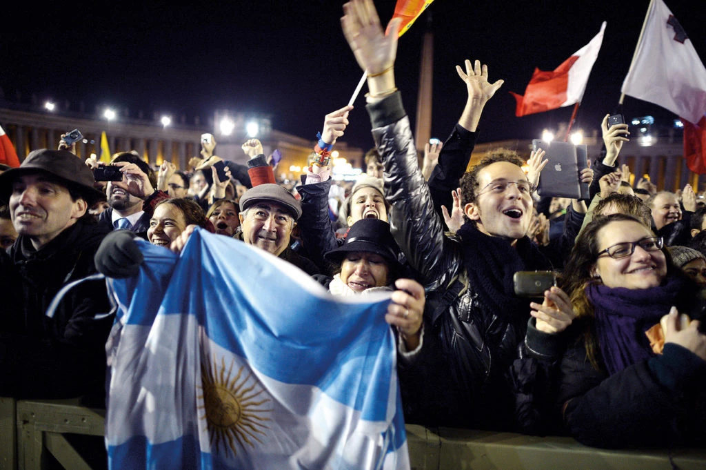 Ante cien mil feligreses (entre ellos, incontables argentinos) desbordando la Plaza de San Pedro, su nombre como Sumo Pontífice (Francisco) y su rostro se dieron a conocer a las 20.13, hora local. Sonriente, pronto señaló: “El deber del Cónclave era darle un obispo a Roma... Parece que mis hermanos cardenales fueron a buscarlo al fin del mundo. Aquí estamos. Les agradezco esta recepción. ¡Gracias!”, respondió a la algarabía general. Muy pocos soñaban con un Santo Padre argentino cuando Benedicto XVI renunció a su cargo el 11 de febrero previo. Bergoglio eligió el nombre por San Francisco de Asís y por San Francisco Javier, de la Compañía de Jesús.