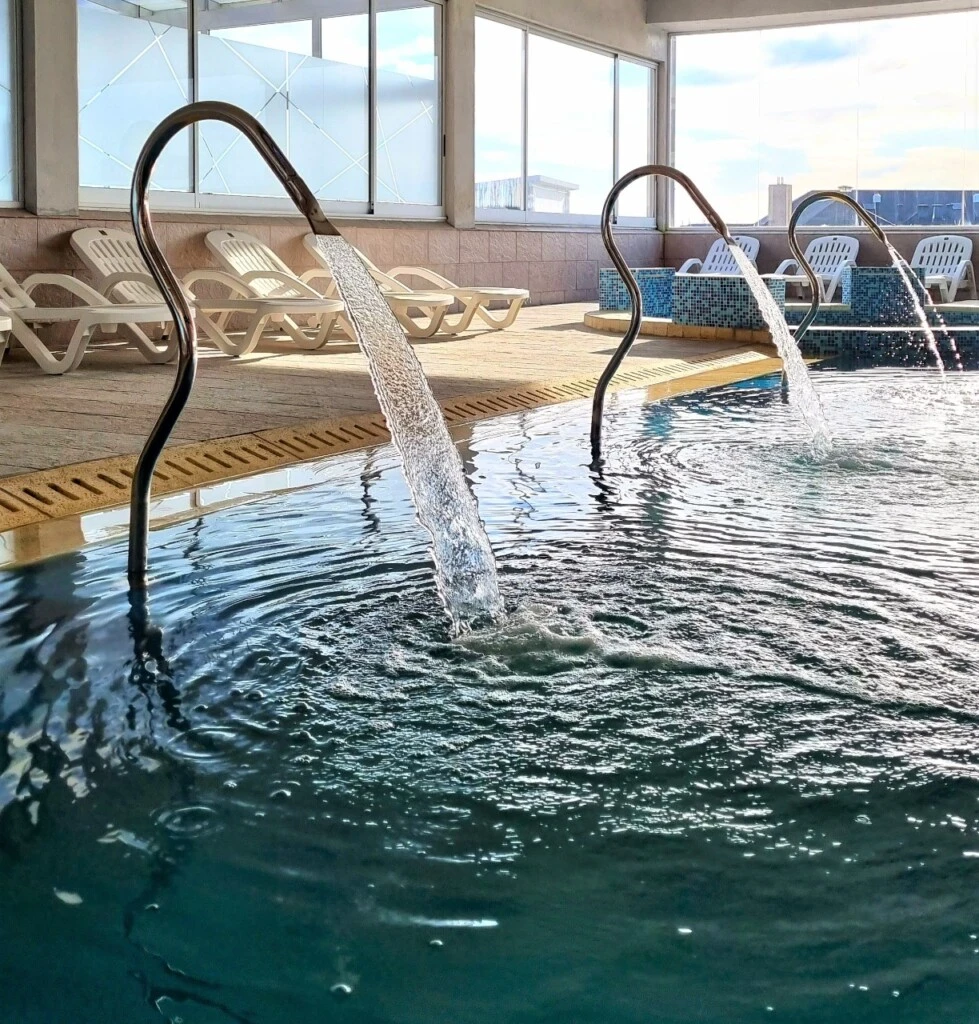 El diseño exclusivo de piletas ensambladas incluye una pileta cubierta y tres semi-cubiertas con diferentes temperaturas de agua termal. En primavera y verano, se habilitan dos piletas adicionales con agua natural fría, sin propiedades minerales.