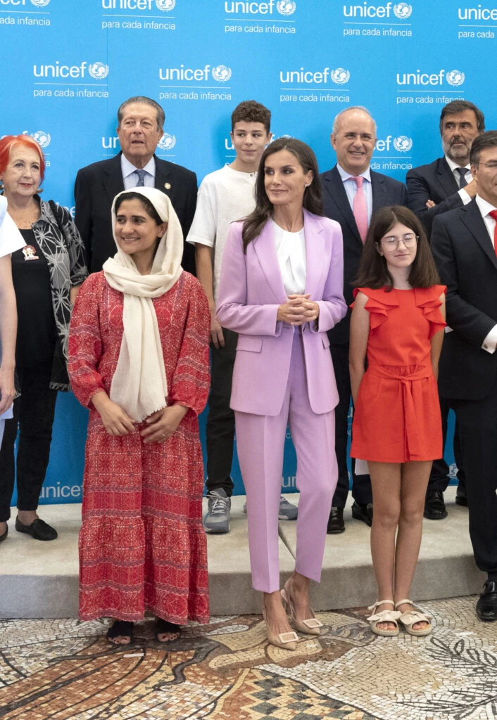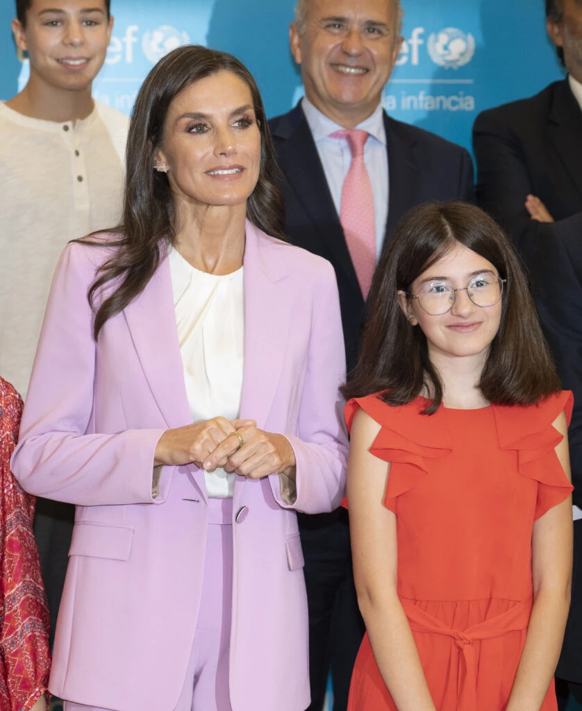 Para la entrega de los Premios UNICEF España, que se celebró en el Consejo Superior de Investigaciones Científicas en la calle Serrano de Madrid y contó con Sara Carbonero, entre otras invitadas, la mujer del rey Felipe VI deslumbró con un traje en tono rosa pastel que viraba al malva.