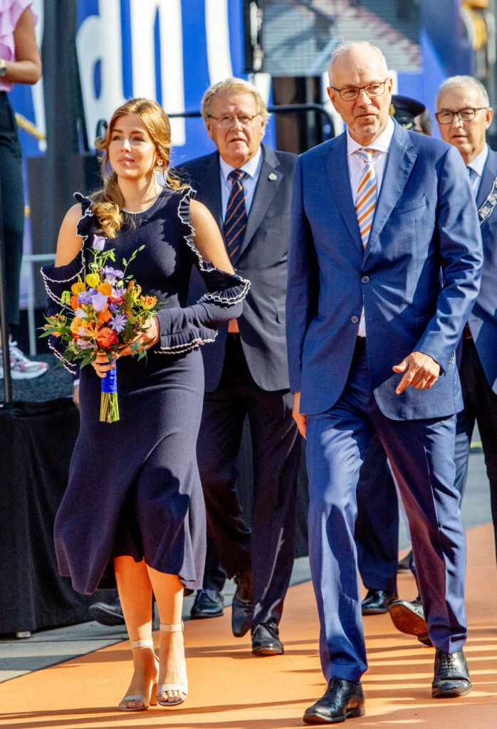 La joven de 18 años se presentó en el puerto de Rotterdam para inaugurar un barco que fue bautizado en honor a la princesa, con su nombre. Allí fue que apareció con un vestido azul marino firmado por Oscar de la Renta, realizado en tejido de punto y con detalles de abertura en mangas y volados con ribetes blancos que supo vestir Máxima en varias oportunidades.