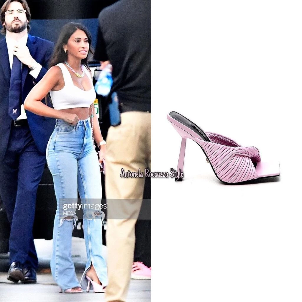 Además de su bolso, volvió a llevar una marca de lujo en los pies: unas sandalias Versace bombeadas efecto Plissé en rosado.