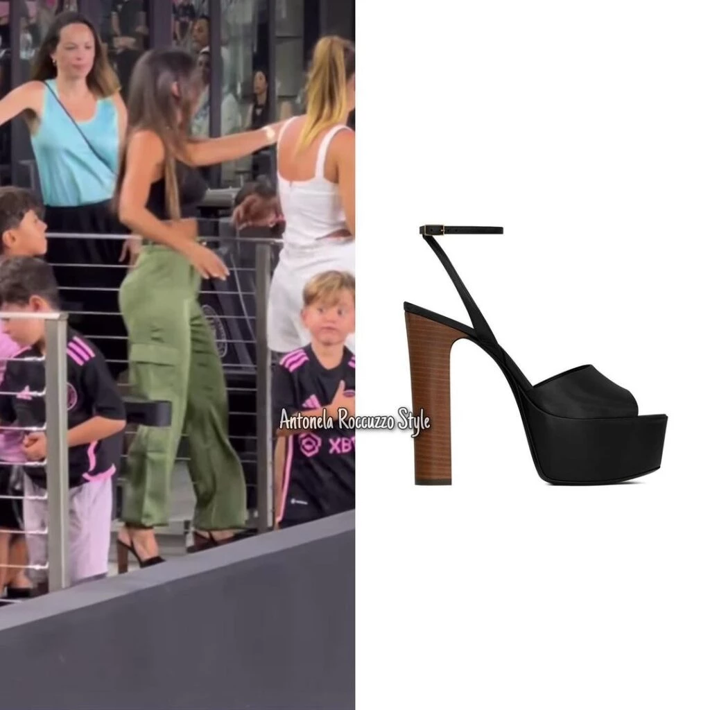 Con un claro guiño al club americano, repitió uno de sus pantalones favoritos en tono fucsia: un pantalón de Marcelo Zanek personalizado. Si bien, este podría ser una de sus piezas más accesibles, la primera dama del Inter Miami sabe elevar cualquier look con sus lujosos accesorios. En este caso: sandalias de plataforma Jodie de SAINT LAURENT ($1.090), y un bolso lady Dior.