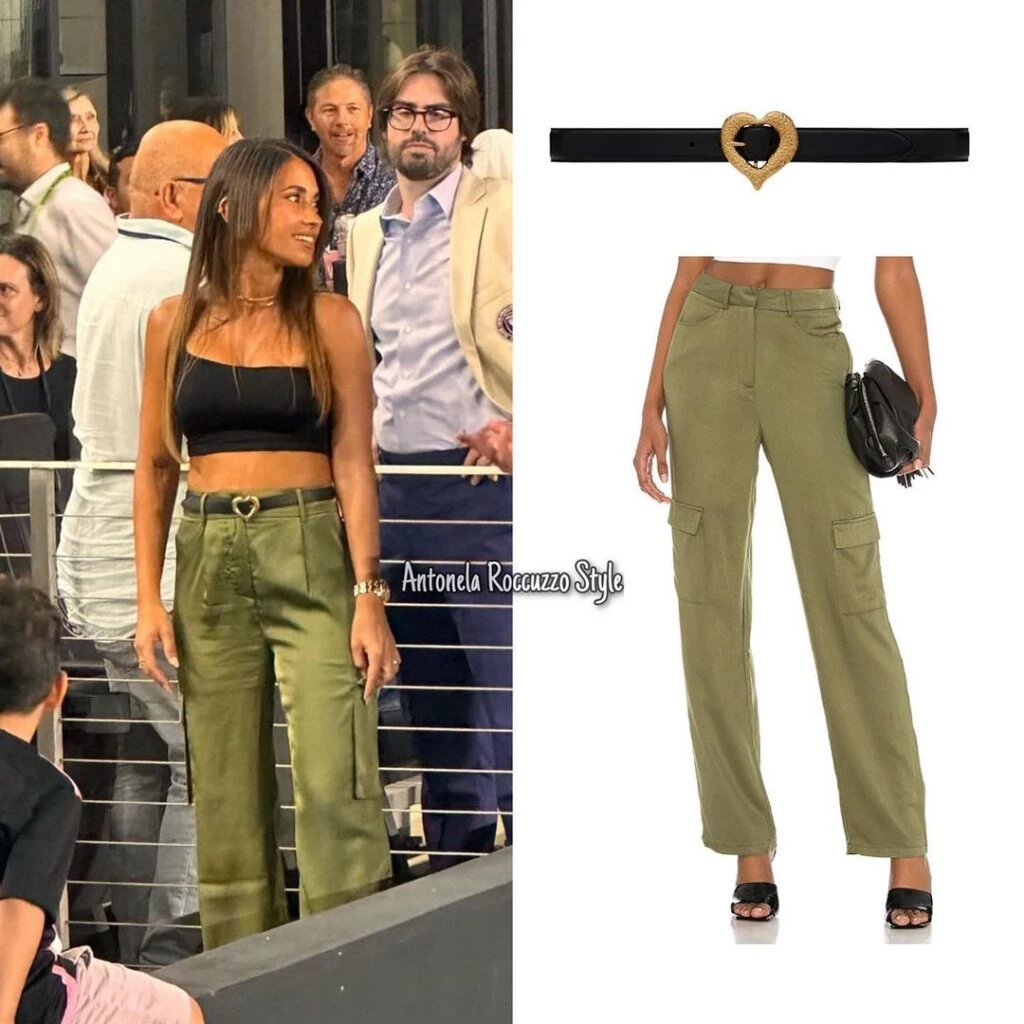 Entre todos los outfits que la rosarina armó para acompañar a Lio Messi en la cancha, entre sus looks más sportish chic y low-cost estuvo el que usó para la presentación del campeón del mundo ante la hinchada del Inter Miami.