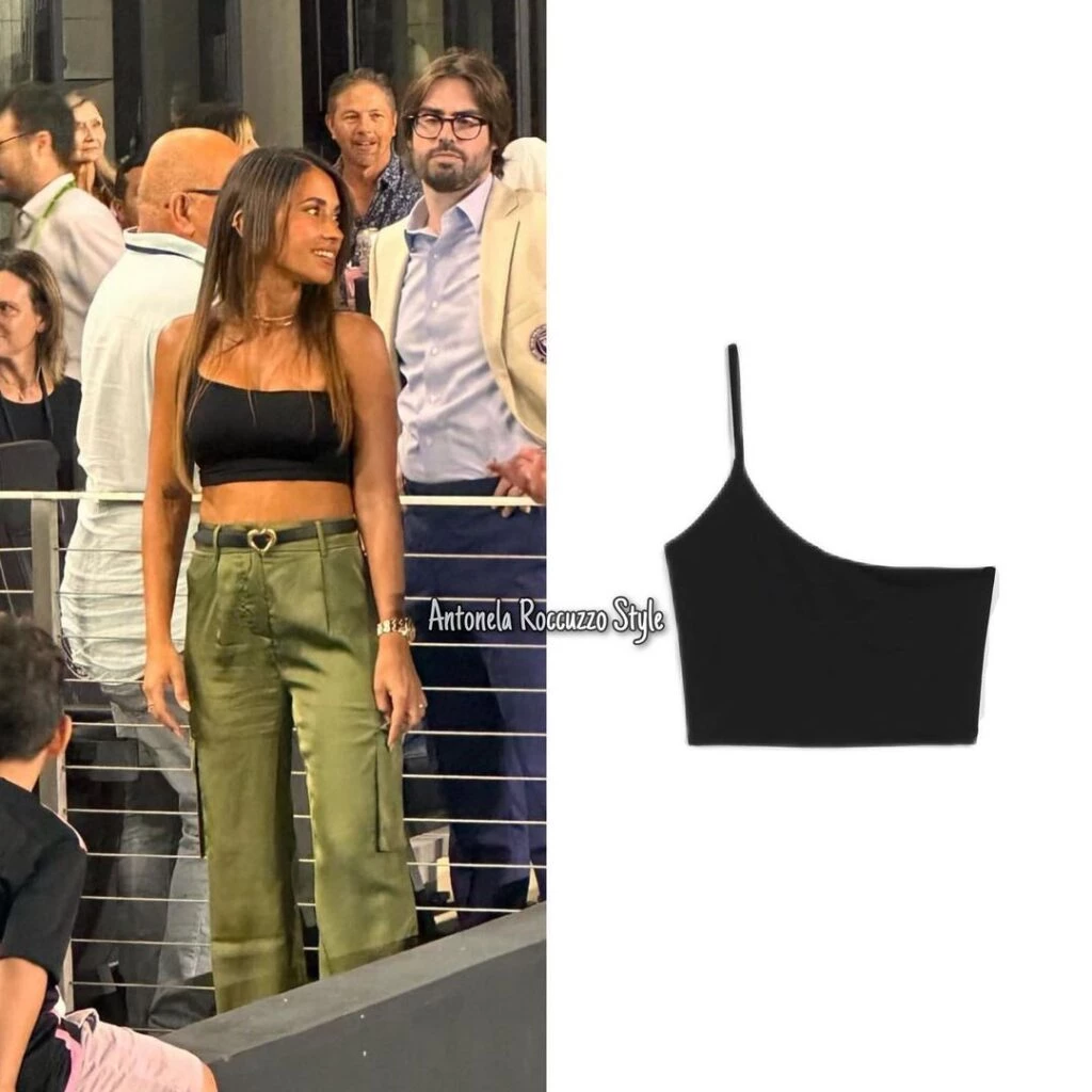 Para el partido que le dio el pase a Messi y el Inter Miami, que los acercó más a la final de la Leagues Cup, Antonela volvió a acudir a las camisetas tipo top, con esta camiseta asimétrica con un tiro en negra de Bershka -marca low-cost-.