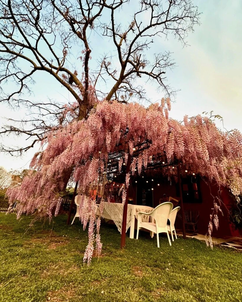 Bajo su sombra se encuentra un área de descanso con sillas blancas y una mesa, ideal para reuniones al aire libre. Durante la noche, el lugar se transforma gracias a las luces colgantes que iluminan cálidamente el entorno, creando un ambiente mágico y romántico.