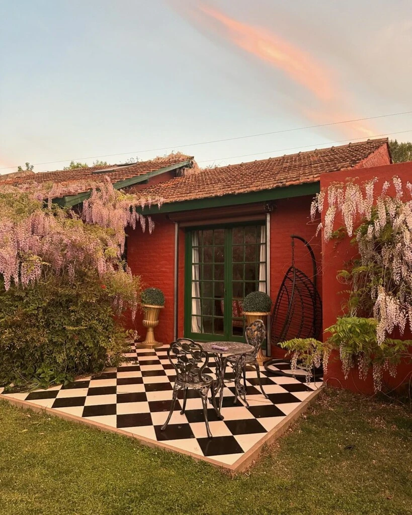 En el suelo, un llamativo patrón de baldosas en blanco y negro, popularmente conocido como damero, aporta un toque vintage que contrasta con las paredes de ladrillo rojo. La zona está decorada con elegantes sillas de hierro blanco forjado y plantas en macetas, creando un pequeño rincón perfecto para tomar el té o relajarse durante la tarde.
