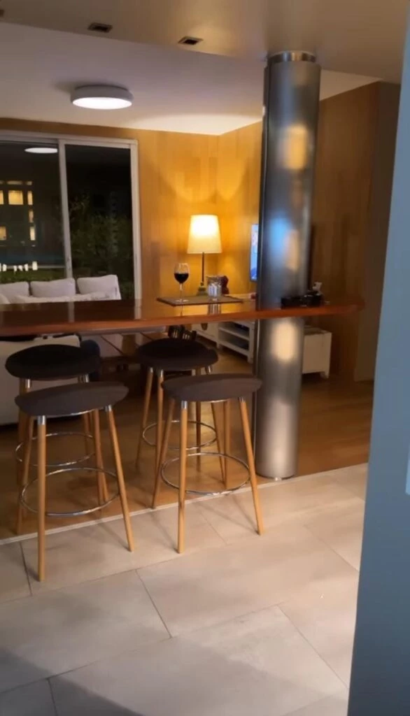 El espacio cuenta con una barra de madera empotrada, y es ideal para relajarse y tomar unas copas de vino al atarceder. Además, cuenta con elegantes banquetas altas con base de madera y detalles en acero, y asientos con un fino tapizado gris topo.