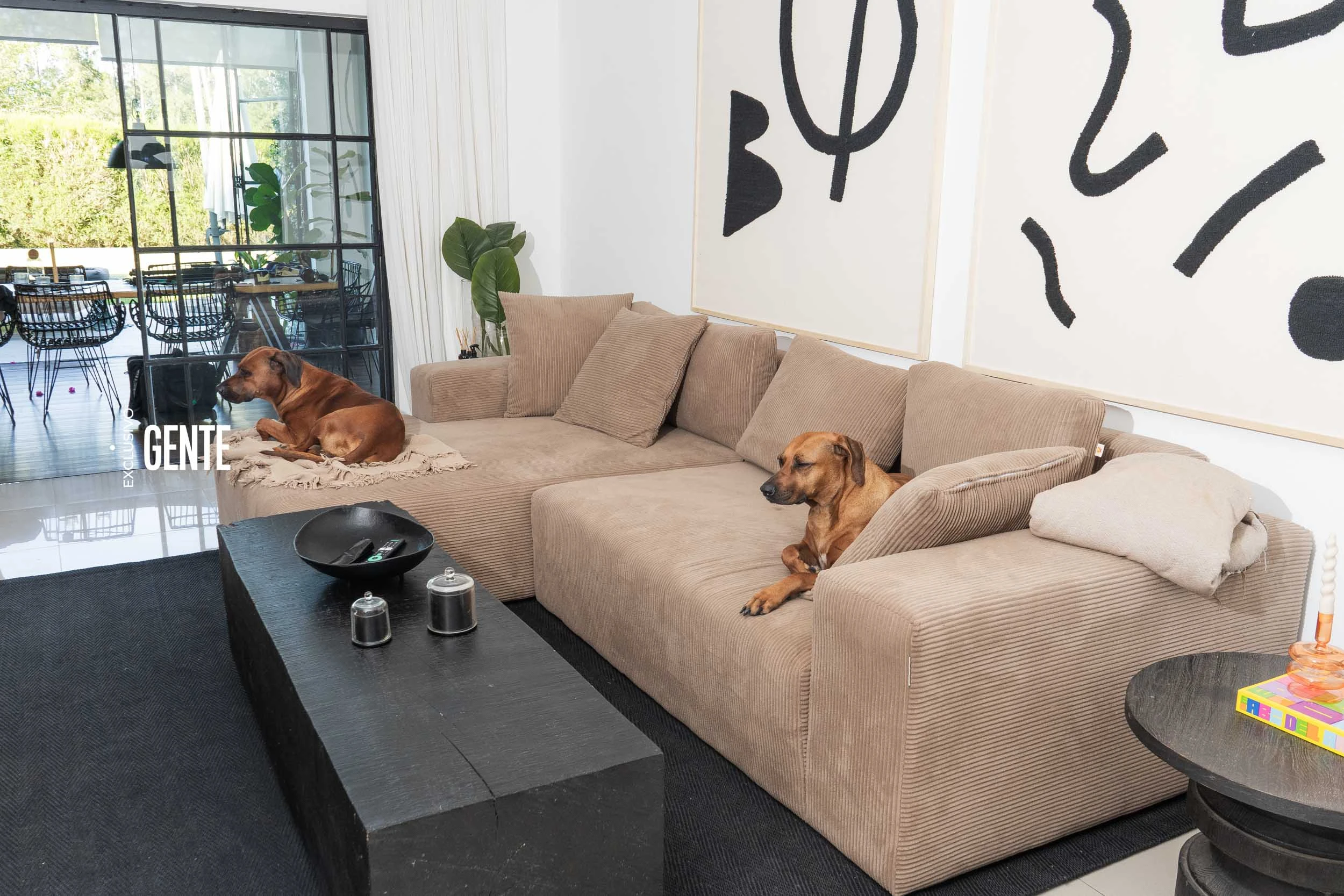 Mientras avanzamos por los distintos ambientes y Diego posa para las fotos, Bobby y Mila no se despegan. “Ellos van a sumarse solos a las fotos”, advierte entre risas. No exagera: durante toda la producción, los “reyes de la casa”, como él mismo los llama, aparecen en cada rincón. Algunas veces atentos a la cámara; otras, más concentrados en cumplir su rol protector.
