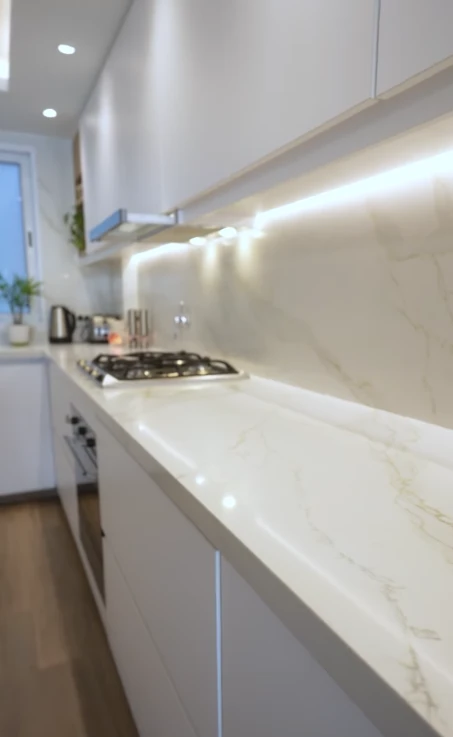 Al comienzo del video, la mayor de las hermana Calabró comentó: "Hoy sí, les voy a mostrar mi cocina nueva". Y mientras mostraba la mesada, reveló uno de los materiales elegidos para esta renovación: "Un cuarzo italiano, que a las vetas naturales del calacata suma las vetas en oro".