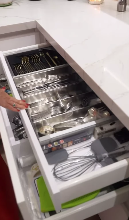Mientras en las imágenes se la veía ordenando los platos y cubiertos en los diferentes espacios de su cocina, se la escuchaba en off comentando: "Los cajones de cierre automático, con cantidad de frascos y frasquitos. Y muchos cubiertos para recibir a mis amigos".