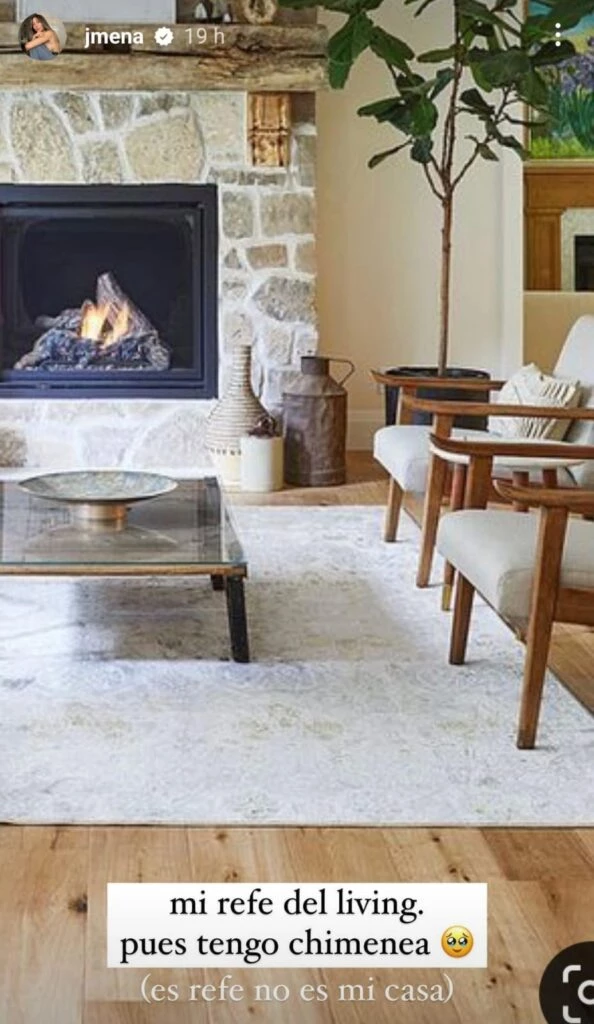 "Mi refe del living, pues tengo chimenea", escribió junto a un emoji emotivo. En la fotografía se puede ver un amplio living con mucho flujo de luz natural, pisos de madera, detalles en piedra, una mesa ratona con tapa de vidrio, una gran alfombra color crudo, un árbol pandurata y dos sillones individuales.