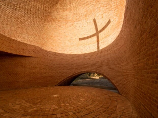 El proyecto fue ideado por el arquitecto rosarino Nicolás Campodónico, quien dedicó cinco años de trabajo a levantar un templo diferente: sin luz eléctrica ni agua corriente, construido íntegramente con ladrillos reutilizados de una antigua casona rural. Con apenas 92 metros cuadrados, el edificio se integra al paisaje en un predio de 10.000 metros cuadrados y logra transmitir una profunda espiritualidad a través de la simplicidad.