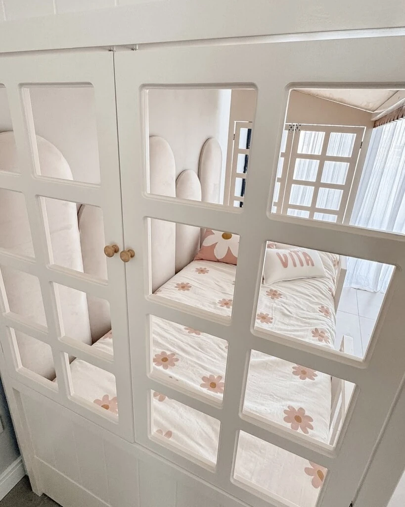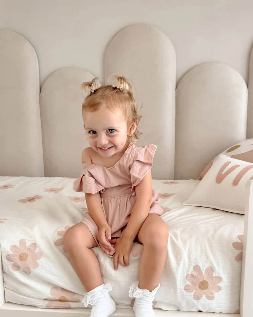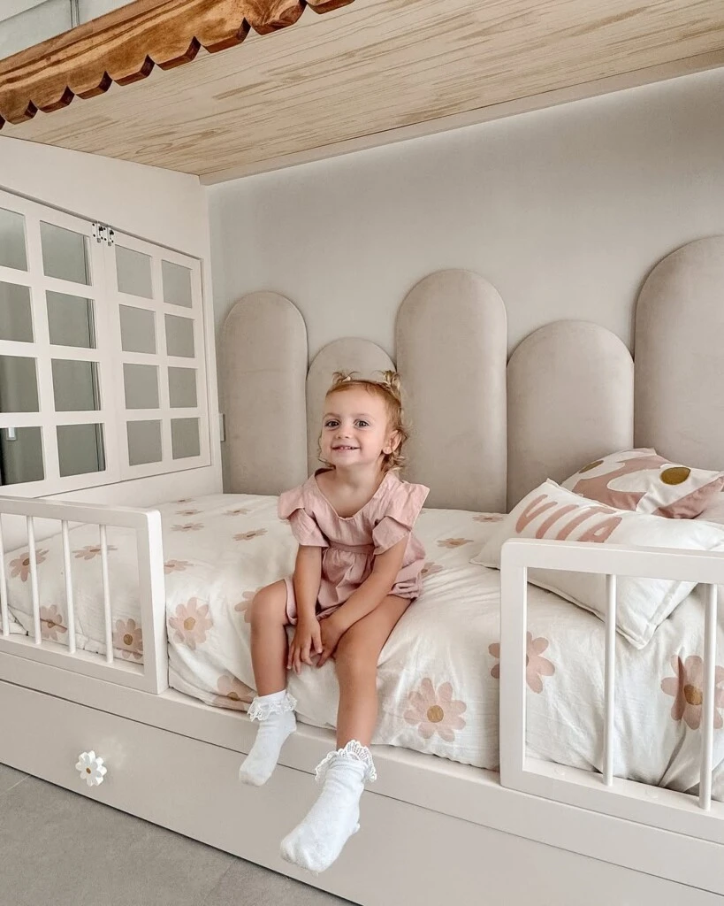 Vale aclarar que los detalles en madera agregan un toque rústico y natural al diseño de la nueva habitación de Vita. Además, los tiradores de los cajones en forma de flores contribuyen a la atmósfera infantil y natural del cuarto.