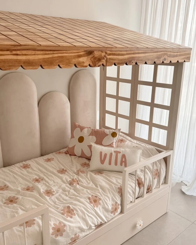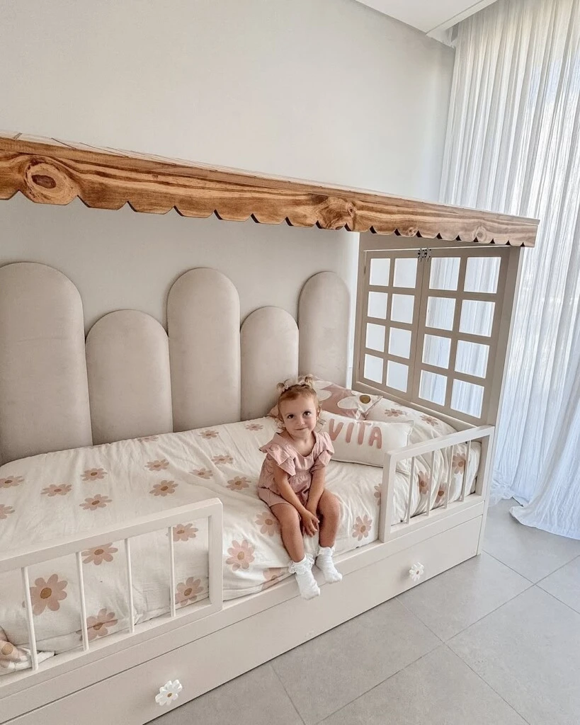 El estilo de la decoración es fresco y acogedor, ideal para una habitación infantil. Y la cama se destaca por tener un techo de madera clara, lo que le da un aire lúdico y agradable a este ambiente. Además, esta estructura también incluye paneles con ventanas, un toque único y divertido.