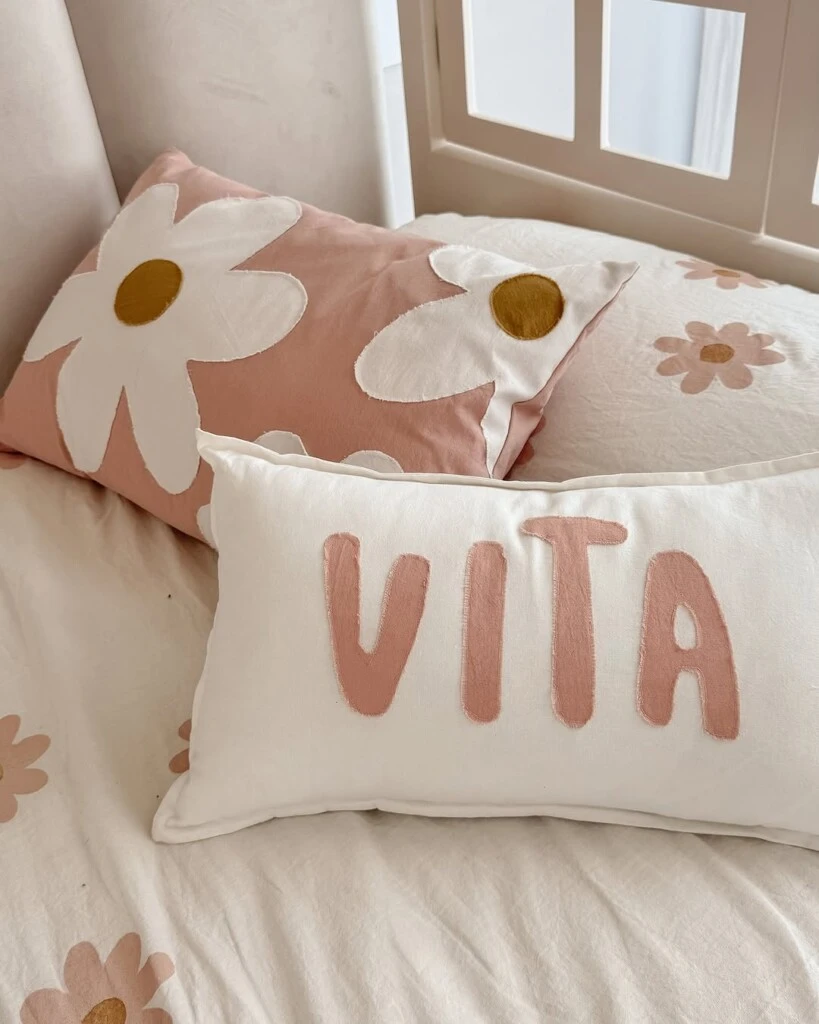 "¡El acolchado y los almohadones quedaron soñados!", añadió Cande en otra línea de su breve descripción. Y sumó: "Por último pensamos el respaldo primero para que Vitu no se lastime con la pared y porque le da un toque increíble al cuarto".