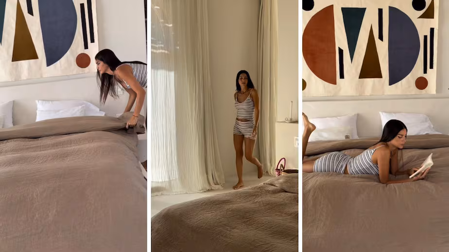 El dormitorio principal de la modelo ha sido diseñado como un refugio personal donde impera la elegancia minimalista y el confort absoluto. La habitación se caracteriza por una paleta de colores neutros, beige, crema y blanco hueso, y el uso de materiales naturales como pisos de madera clara, ropa de cama de lino y cestas de mimbre.