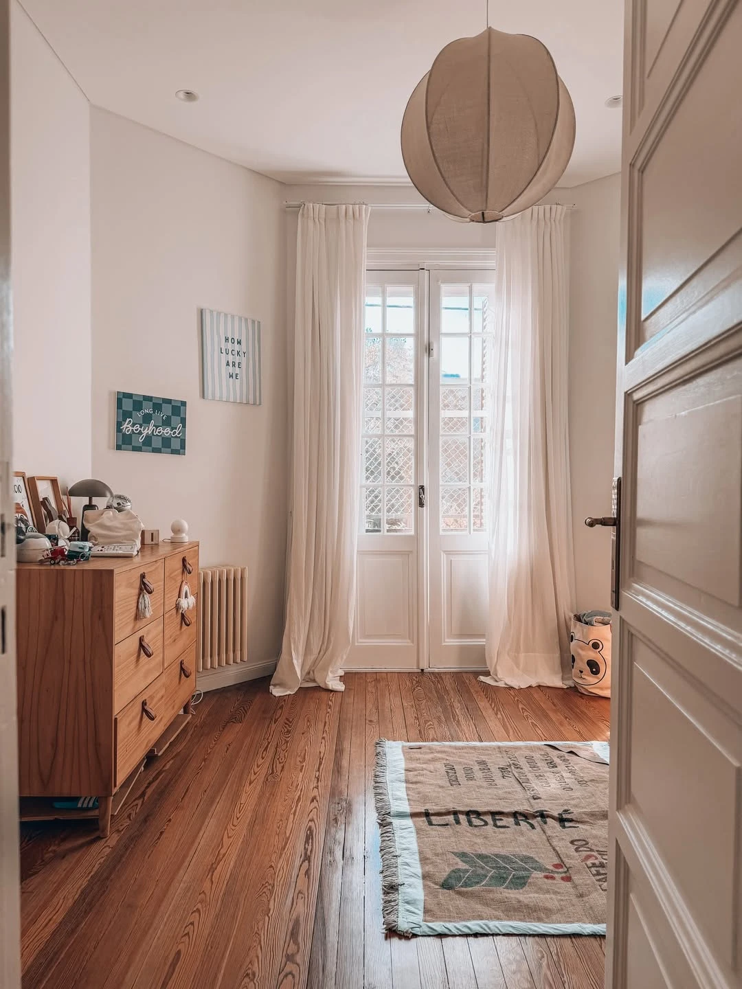 Ese mismo idioma se traslada a otro ambiente con piso de madera más oscuro —de vetas marcadas— y una puerta-ventana vidriada enmarcada por cortinas largas y livianas, casi etéreas. La tela translúcida deja pasar el día sin perder intimidad y, con el movimiento, suma una cuota de hotel boutique. Sobre una cómoda de madera cálida se ven objetos cotidianos y algunos marcos apoyados, lo que refuerza la idea de casa vivida, en transición: la reforma terminó, pero la decoración recién empieza. En la pared, dos cuadros con frases cortas y estética gráfica suman un toque casual sin romper la calma general.
