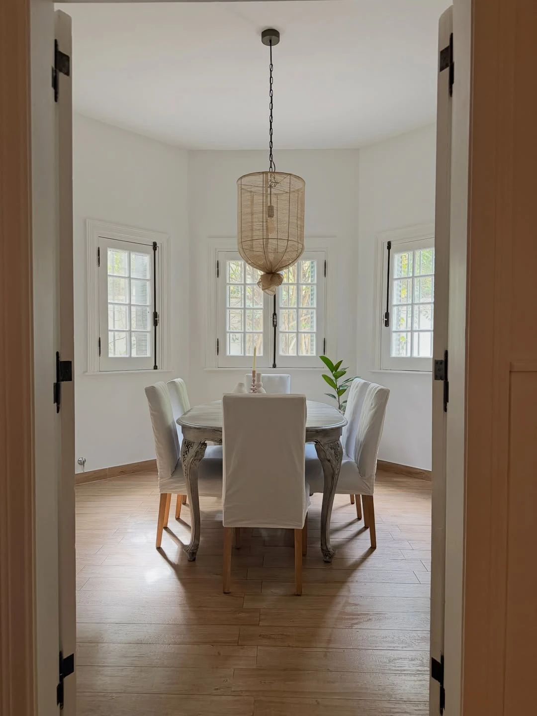 El primer golpe de vista es el comedor, planteado como una escena simple y elegante. La mesa, de madera con apariencia gastada y tono grisáceo, aporta ese aire de pieza con historia, mientras que las sillas vestidas con fundas blancas refuerzan la sensación de frescura. El espacio se abre en un volumen casi octogonal que se apoya en varias ventanas con postigos y herrajes oscuros: entra luz por todos lados y la casa respira. En el centro, una lámpara colgante de fibras (tipo ratán) baja el techo visualmente y suma textura, como un guiño mediterráneo que suaviza el blanco dominante de paredes y carpinterías.