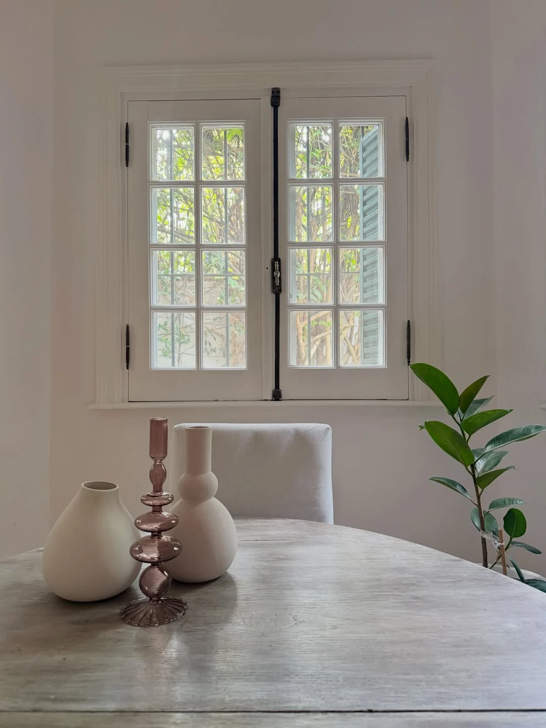 Un acercamiento al mismo comedor muestra la lógica minimalista de la deco: sobre la mesa, dos jarrones blancos de líneas redondeadas y un candelabro rosado funcionan como “puntos” de diseño. No hay exceso: hay elección. Y al costado, una planta de hojas verdes aporta el contraste orgánico imprescindible cuando la paleta se apoya en blancos, crudos y madera.