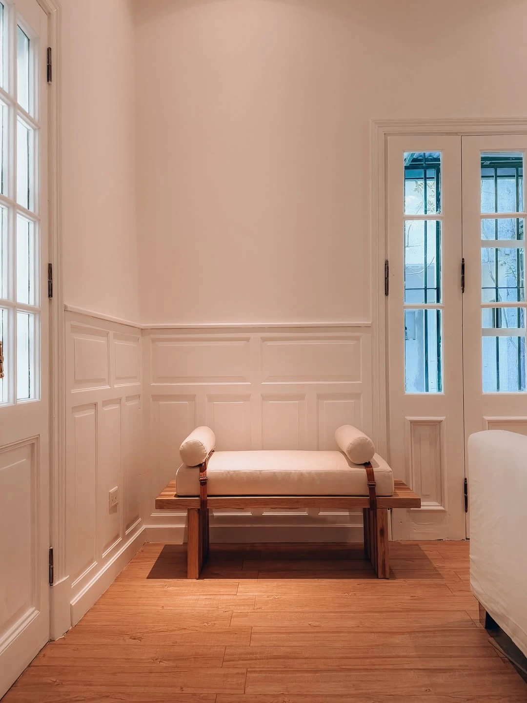 En un rincón más “arquitectónico” aparece uno de los grandes aciertos de la obra: boiserie y zócalos altos (panelería clásica a media altura) pintados del mismo blanco que las paredes. Ese recurso eleva el ambiente inmediatamente, lo vuelve más sofisticado y define un estilo: clásico contemporáneo, sin solemnidad. Ahí se apoya una banqueta tipo daybed de madera, tapizada en crudo y con correas de cuero visibles, una pieza de diseño que equilibra tradición y modernidad. La carpintería vidriada cercana —con cuarterones— vuelve a insistir en una obsesión feliz: que la luz circule.