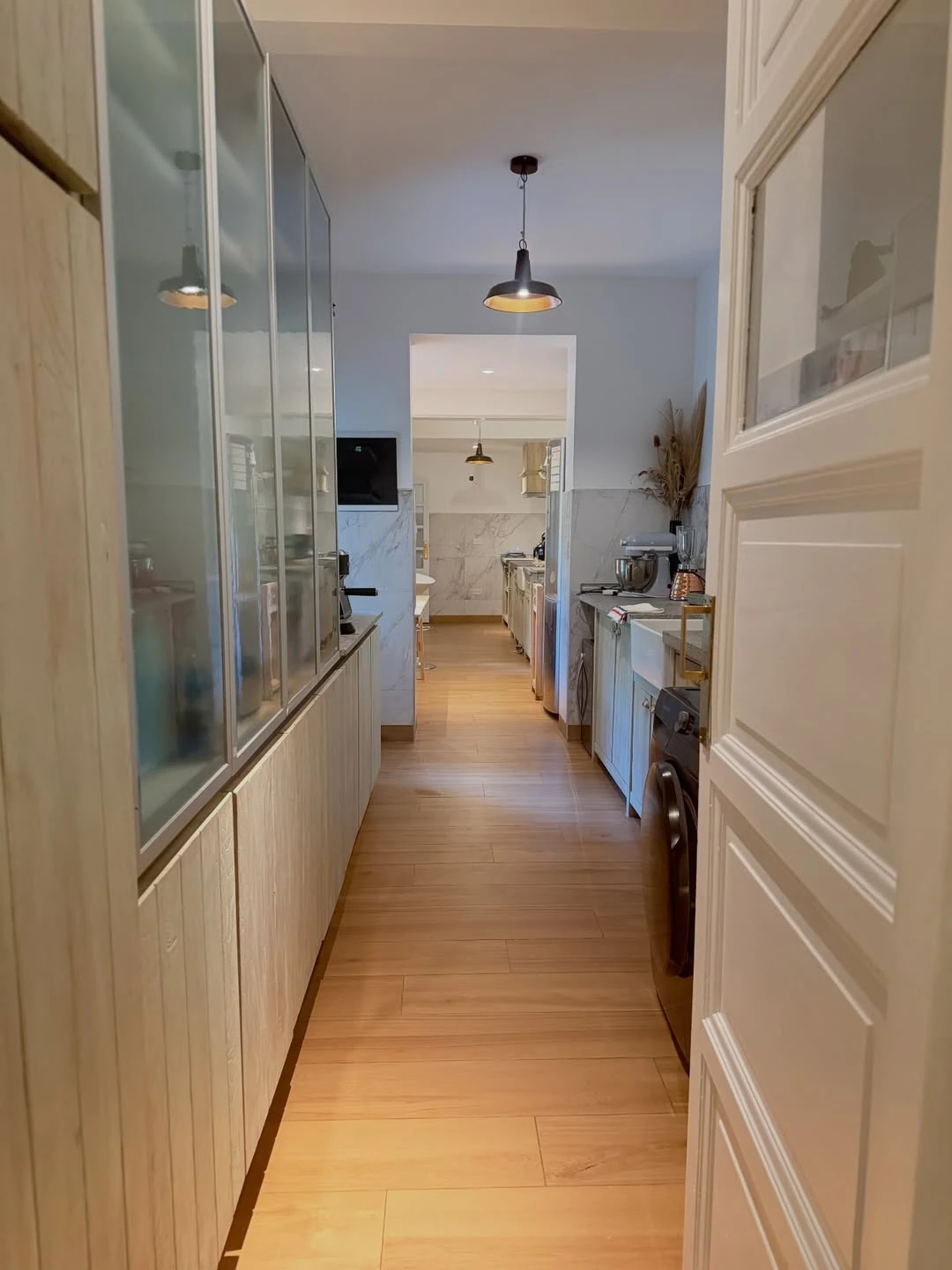 La cocina se muestra como un pasillo largo y eficiente, con una distribución tipo galley. Predomina la madera clara en muebles, algunos con frentes vidriados, y aparecen superficies de aspecto marmolado en mesadas y revestimientos. La iluminación combina empotrados con una lámpara colgante metálica que marca el eje del recorrido. Es una cocina pensada para el uso real, con electrodomésticos a la vista y guardado generoso, pero cuidada en materiales y terminaciones.