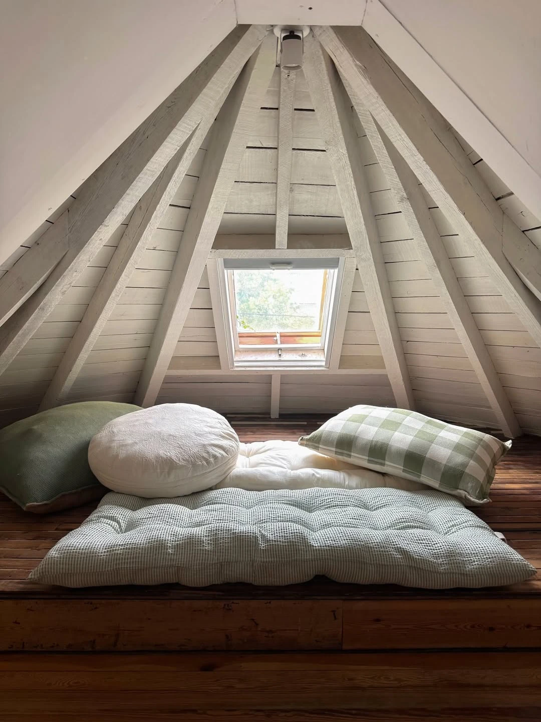 La reforma también se permitió un gesto más lúdico y emotivo: un altillo convertido en refugio. Se ven vigas expuestas pintadas en blanco, revestimiento de madera en el techo a dos aguas y una ventana de techo que enmarca el cielo. En el piso, un colchón bajo con almohadones en verdes suaves y blancos invita a leer, descansar o simplemente estar. Es un espacio de escala íntima, casi de cabaña, donde la madera del suelo aporta abrigo visual.