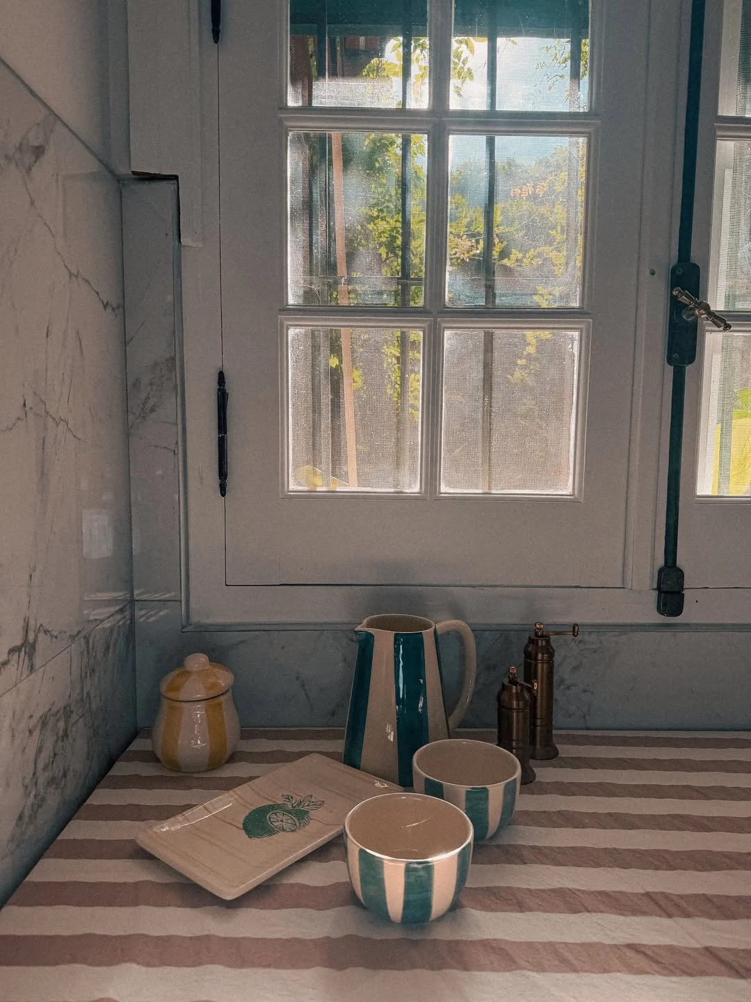 Un detalle encantador: una escena sobre la mesada junto a la ventana, con un paño a rayas como base y cerámicas en blanco y celeste (jarra y cuencos) que suman color sin alterar el tono sereno del conjunto. La ventana con cuadricula y herrajes oscuros repite la identidad de la casa; el verde del exterior se filtra como si fuera parte de la paleta interior.
