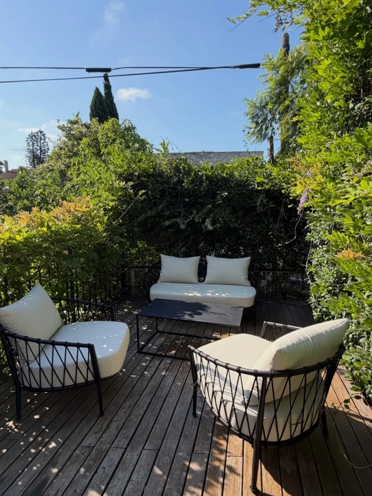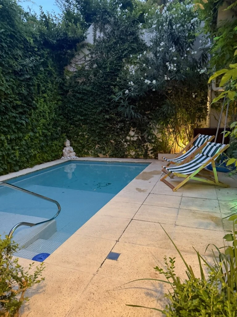 Y afuera, el cambio se vuelve atmósfera. El patio muestra una piscina compacta rodeada de losetas claras, con muros cubiertos de vegetación que convierten el perímetro en un tapiz verde. Dos reposeras de lona a rayas (blanco y verde) refuerzan el espíritu relajado, de verano largo. En otra postal, una terraza de deck con sillones de estructura negra y almohadones claros se arma como living exterior: liviano, fresco, rodeado de plantas y con cielo abierto como techo.